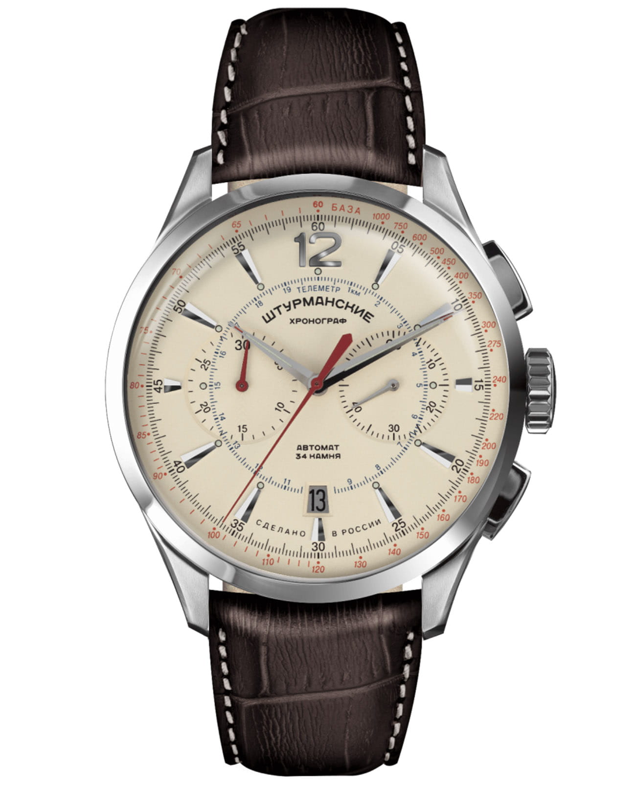 Лимитированные мужские российские механические часы-хронографХронографФункция позволяет измерять отрезки времени с особой точностью: часы, минуты, секунды. Верным признаком хронографа является наличие на циферблате 3 дополнительных окошек-счётчиков. с секундомеромСекундомерСекундоме́р — прибор, способный измерять интервалы времени с точностью до долей секунды. Штурманские Открытый Космос NE86/1855017, механический механизм (автоматический калибр) с высокой точностью. Лимитированная серия - 500 экземпляров, посвящена первому выходу человека в открытый космос. Сапфировое стеклоСапфировое стеклоПрочный и надёжный материал из кристалла сапфира синтетического происхождения, характеризующийся особой твёрдостью и устойчивостью к царапинам и повреждениям. устойчивое к появлению царапин, обладающее высокой прозрачностью. Класс водозащиты: 50 метров, позволит защитить корпус от случайных брызг или капель дождя. Корпус часов изготовлен из стали. Кожаный ремешок на стандартной застёжке. Стрелки и метки с люминесцентным покрытиемЛюминесцентное покрытиеПозволяет считывать показания времени в темноте. Производители наносят на стрелки, часовые индексы, безель или поверхность циферблата светонакопительный состав, дающий холодное свечение.. Стальной корпус надежно защищает от повреждений механический японский калибр Seiko NE86 на 34 камня с запасом хода 42 часа. Подзавод у часов автоматический.