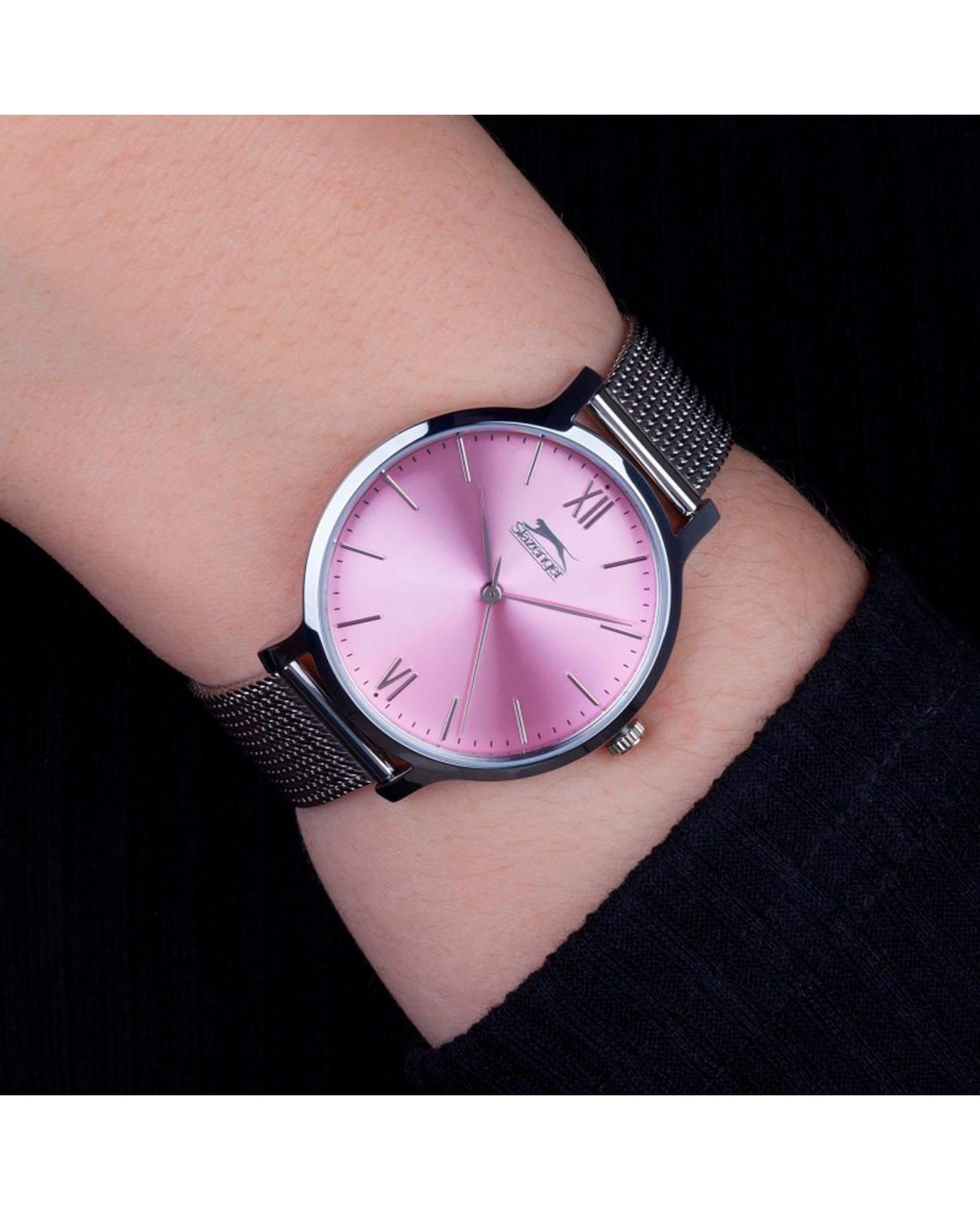 Женские наручные часы Slazenger SL.09.1823.2.07 из коллекции Essentials сочетают в себе элегантный дизайн и практичность современных технологий. Модель обладает круглым корпусом диаметром 34 мм, изготовленным из нержавеющей стали с серебряным покрытием, что обеспечивает высокую устойчивость к внешним воздействиям. Браслет миланского плетения с застежкой раскладной замокРаскладной замокДанный вариант застежки используется только на часах с металлическим браслетом. Отличительная особенность такого крепления в том, что длина браслета становится универсальной и вы можете самостоятельно отрегулировать нужный вам размер – застежка просто двигается по браслету часов., гарантирующей комфортное ношение и безопасность. Розовый циферблат делает модель особенно женственной и привлекательной. Для защиты используется минеральное стеклоМинеральное стеклоМинеральное стекло представляет собой искусственно выращенный минерал кварца. Такое стекло отличается особой устойчивостью к повреждениям и царапинам. Уступает по некоторым качествам сапфировому стеклу., обеспечивающее прочную защиту от царапин. Часы работают на японском кварцевом механизме, что гарантирует точное время без необходимости подзаводки. Водонепроницаемость часов составляет 3 атмосферы (30 метров), что позволяет использовать их в повседневной жизни, но не рекомендуется для плавания или водных видов спорта.