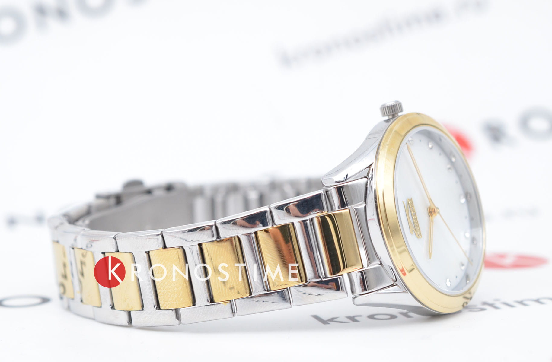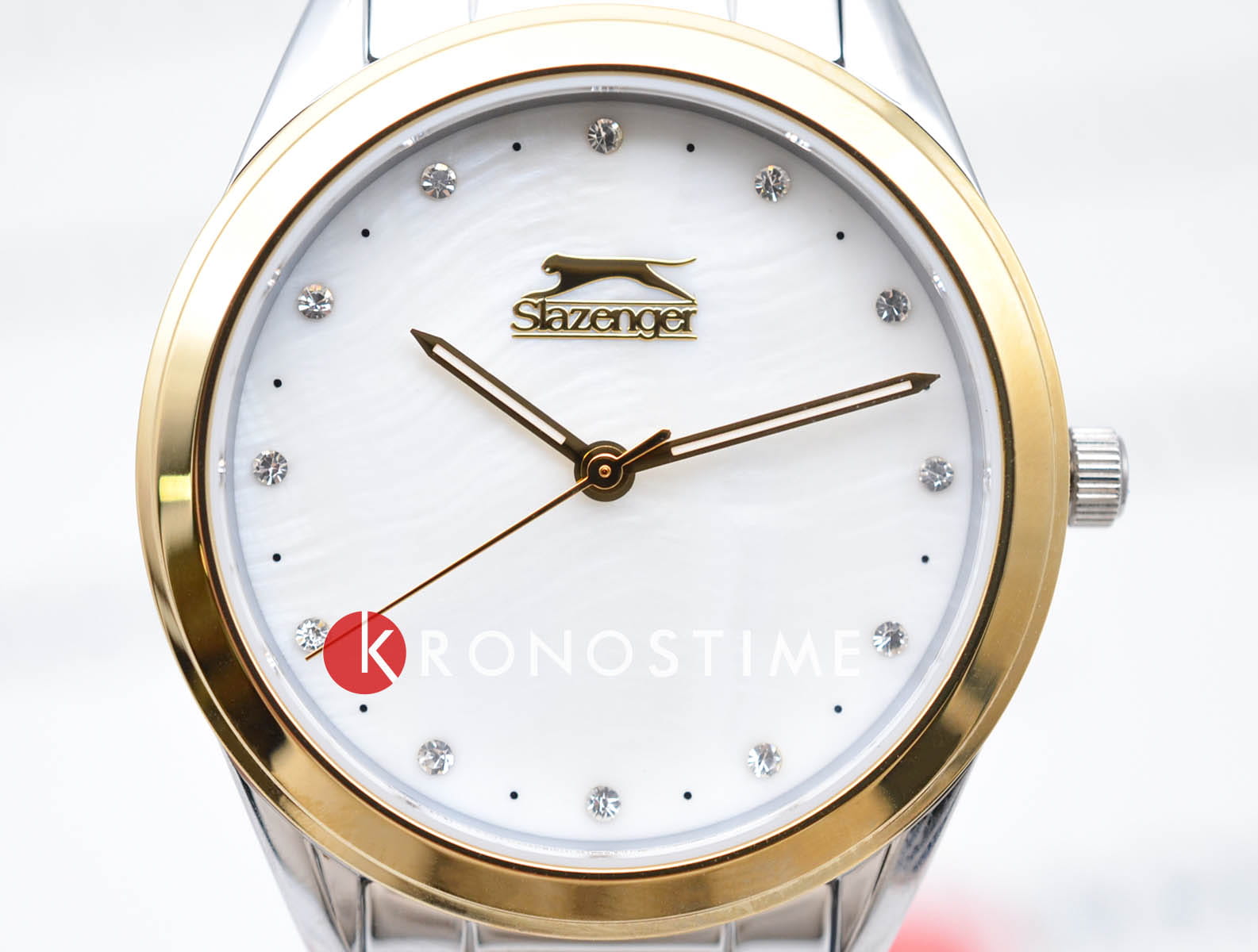 Женские наручные часы Slazenger SL.09.2013.3.04 из коллекции, сочетающей элегантность и практичность в классическом дизайне. Модель обладает круглым корпусом диаметром 35 мм, изготовленным из суперметалла, что обеспечивает высокую устойчивость к внешним воздействиям. БезельБезельВнешний ободок, закрепляющий стекло. В спортивных часах так называется поворотное кольцо с делениями на циферблате, выполняет роль таймера – замеряет отрезки времени на шкале. Неподвижный безель – элемент декора. Однонаправленно вращающийся безель на дайверских часах позволяет фиксировать моменты погружения и выныривания на поверхность. с IP-покрытиемIP-покрытиеМетод ионного напыления. Демонстрирует повышенную устойчивость к истиранию, окислению и химическим веществам. Под воздействием высокого давления и температуры около 1500°C молекулы металла надёжно соединяются с частицами корпуса часов.. Циферблат украшен кристаллами в виде фианитов, добавляя модели особую роскошь и шарм. Для защиты используется минеральное стеклоМинеральное стеклоМинеральное стекло представляет собой искусственно выращенный минерал кварца. Такое стекло отличается особой устойчивостью к повреждениям и царапинам. Уступает по некоторым качествам сапфировому стеклу., обеспечивающее надежную защиту от царапин. Часы комплектуются браслетом из нержавеющей стали с комбинированным цветом серебро с золотом и раскладной застежкойРаскладной замокДанный вариант застежки используется только на часах с металлическим браслетом. Отличительная особенность такого крепления в том, что длина браслета становится универсальной и вы можете самостоятельно отрегулировать нужный вам размер – застежка просто двигается по браслету часов., гарантирующей комфортное ношение. Модель работает на кварцевом механизме, что обеспечивает высокую точность хода времени. Водонепроницаемость часов составляет 3 атмосферы (30 метров), подходящую для ежедневного использования, но не рекомендуется для плавания или дайвинга.