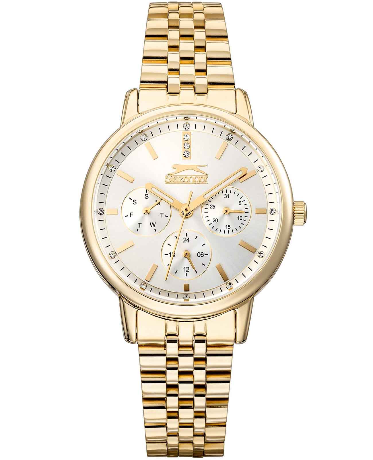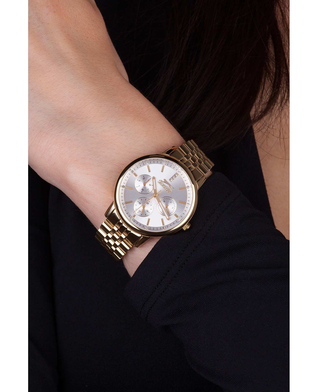 Часы Slazenger SL.09.2050.4.03 — это элегантное сочетание стиля и функциональности, созданное специально для женщин. Их изысканный серебристый циферблат и корпус с безелемБезельВнешний ободок, закрепляющий стекло. В спортивных часах так называется поворотное кольцо с делениями на циферблате, выполняет роль таймера – замеряет отрезки времени на шкале. Неподвижный безель – элемент декора. Однонаправленно вращающийся безель на дайверских часах позволяет фиксировать моменты погружения и выныривания на поверхность. из суперметалла с IP-покрытиемIP-покрытиеМетод ионного напыления. Демонстрирует повышенную устойчивость к истиранию, окислению и химическим веществам. Под воздействием высокого давления и температуры около 1500°C молекулы металла надёжно соединяются с частицами корпуса часов. придают часам современный и утонченный вид. Внутри скрыт надежный кварцевый механизм, который гарантирует точность и долговечность. Минеральное стеклоМинеральное стеклоМинеральное стекло представляет собой искусственно выращенный минерал кварца. Такое стекло отличается особой устойчивостью к повреждениям и царапинам. Уступает по некоторым качествам сапфировому стеклу. защищает часы от царапин, а украшение из фианитов добавляет изысканный акцент.  Люминесцентное покрытиеЛюминесцентное покрытиеПозволяет считывать показания времени в темноте. Производители наносят на стрелки, часовые индексы, безель или поверхность циферблата светонакопительный состав, дающий холодное свечение. на стрелках позволяют легко считывать время даже в темноте. Функциональность часов дополнена 24-часовым указателем времени, календарем даты и дня недели. Браслет из суперметалла с IP-покрытиемIP-покрытиеМетод ионного напыления. Демонстрирует повышенную устойчивость к истиранию, окислению и химическим веществам. Под воздействием высокого давления и температуры около 1500°C молекулы металла надёжно соединяются с частицами корпуса часов. и раскладной застёжкойРаскладная застёжкаТакой тип застёжки используется только на браслетах из металла. Она никогда не раскрывается полностью, происходит разделение на 2 и более частей. Раскладывающая застёжка снизит вероятность потери часов к минимуму. подчеркивает женственность дизайна и обеспечивает комфорт в носке. Диаметр корпуса составляет 35 мм, а толщина — 9 мм, что делает их идеальным аксессуаром для любой стильной женщины. Водозащита уровня 3 ATM позволяет не беспокоиться о случайных брызгах.