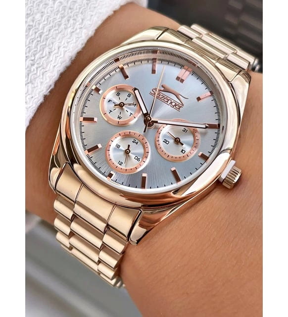 Женские наручные часы Slazenger SL.09.2063.4.02 сочетают в себе классический дизайн и высокое качество исполнения. Модель обладает круглым корпусом диаметром 36 мм, изготовленным из суперметалла с золотистым IP-покрытиемIP-покрытиеМетод ионного напыления. Демонстрирует повышенную устойчивость к истиранию, окислению и химическим веществам. Под воздействием высокого давления и температуры около 1500°C молекулы металла надёжно соединяются с частицами корпуса часов. покрытием, что обеспечивает устойчивость к внешним воздействиям. Браслет выполнен из суперметалла с IP-покрытиемIP-покрытиеМетод ионного напыления. Демонстрирует повышенную устойчивость к истиранию, окислению и химическим веществам. Под воздействием высокого давления и температуры около 1500°C молекулы металла надёжно соединяются с частицами корпуса часов. на раскладной застёжкеРаскладная застёжкаТакой тип застёжки используется только на браслетах из металла. Она никогда не раскрывается полностью, происходит разделение на 2 и более частей. Раскладывающая застёжка снизит вероятность потери часов к минимуму.. Белый циферблат украшен логотипом бренда и метками времени. Имеются дополнительные малые циферблаты для отображения даты, дня недели и текущего времени в 24-часовом формате. Для защиты используется минеральное стеклоМинеральное стеклоМинеральное стекло представляет собой искусственно выращенный минерал кварца. Такое стекло отличается особой устойчивостью к повреждениям и царапинам. Уступает по некоторым качествам сапфировому стеклу., обеспечивающее прочную защиту от царапин. Стрелки и метки имеют люминесцентное покрытиеЛюминесцентное покрытиеПозволяет считывать показания времени в темноте. Производители наносят на стрелки, часовые индексы, безель или поверхность циферблата светонакопительный состав, дающий холодное свечение., что позволяет легко читать время в темноте. Часы работают на японском кварцевом механизме, который обеспечивает точность хода без необходимости подзаводки. Водонепроницаемость часов составляет 3 атмосферы (WR30), что позволяет защитить корпус от случайных брызг или капель дождя.