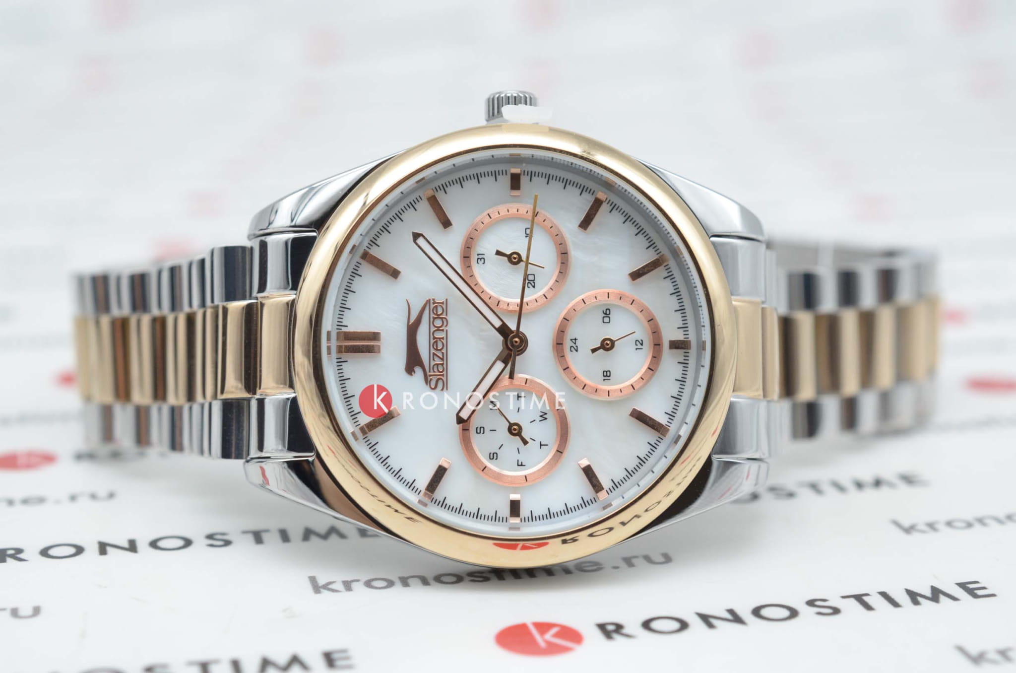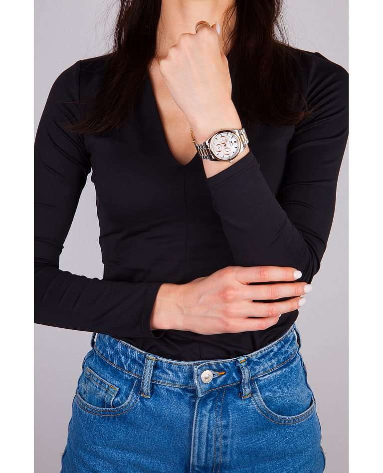 Женские наручные часы Slazenger SL.09.2063.4.04 сочетают в себе классический дизайн и высокое качество исполнения. Модель обладает круглым корпусом диаметром 36 мм, изготовленным из суперметалла, что обеспечивает устойчивость к внешним воздействиям. Браслет выполнен из суперметалла с частичным IP-покрытиемIP-покрытиеМетод ионного напыления. Демонстрирует повышенную устойчивость к истиранию, окислению и химическим веществам. Под воздействием высокого давления и температуры около 1500°C молекулы металла надёжно соединяются с частицами корпуса часов. на раскладной застёжкеРаскладная застёжкаТакой тип застёжки используется только на браслетах из металла. Она никогда не раскрывается полностью, происходит разделение на 2 и более частей. Раскладывающая застёжка снизит вероятность потери часов к минимуму.. Неподвижный безельБезельВнешний ободок, закрепляющий стекло. В спортивных часах так называется поворотное кольцо с делениями на циферблате, выполняет роль таймера – замеряет отрезки времени на шкале. Неподвижный безель – элемент декора. Однонаправленно вращающийся безель на дайверских часах позволяет фиксировать моменты погружения и выныривания на поверхность. из суперметалла с IP-покрытиемIP-покрытиеМетод ионного напыления. Демонстрирует повышенную устойчивость к истиранию, окислению и химическим веществам. Под воздействием высокого давления и температуры около 1500°C молекулы металла надёжно соединяются с частицами корпуса часов. цвета розового золота. Перламутровый циферблат украшен логотипом бренда и метками времени. Имеются дополнительные малые циферблаты для отображения даты, дня недели и текущего времени в 24-часовом формате. Для защиты используется минеральное стеклоМинеральное стеклоМинеральное стекло представляет собой искусственно выращенный минерал кварца. Такое стекло отличается особой устойчивостью к повреждениям и царапинам. Уступает по некоторым качествам сапфировому стеклу., обеспечивающее прочную защиту от царапин. Стрелки и метки имеют люминесцентное покрытиеЛюминесцентное покрытиеПозволяет считывать показания времени в темноте. Производители наносят на стрелки, часовые индексы, безель или поверхность циферблата светонакопительный состав, дающий холодное свечение., что позволяет легко читать время в темноте. Часы работают на японском кварцевом механизме, который обеспечивает точность хода без необходимости подзаводки. Водонепроницаемость часов составляет 3 атмосферы (WR30), что позволяет защитить корпус от случайных брызг или капель дождя.