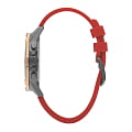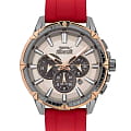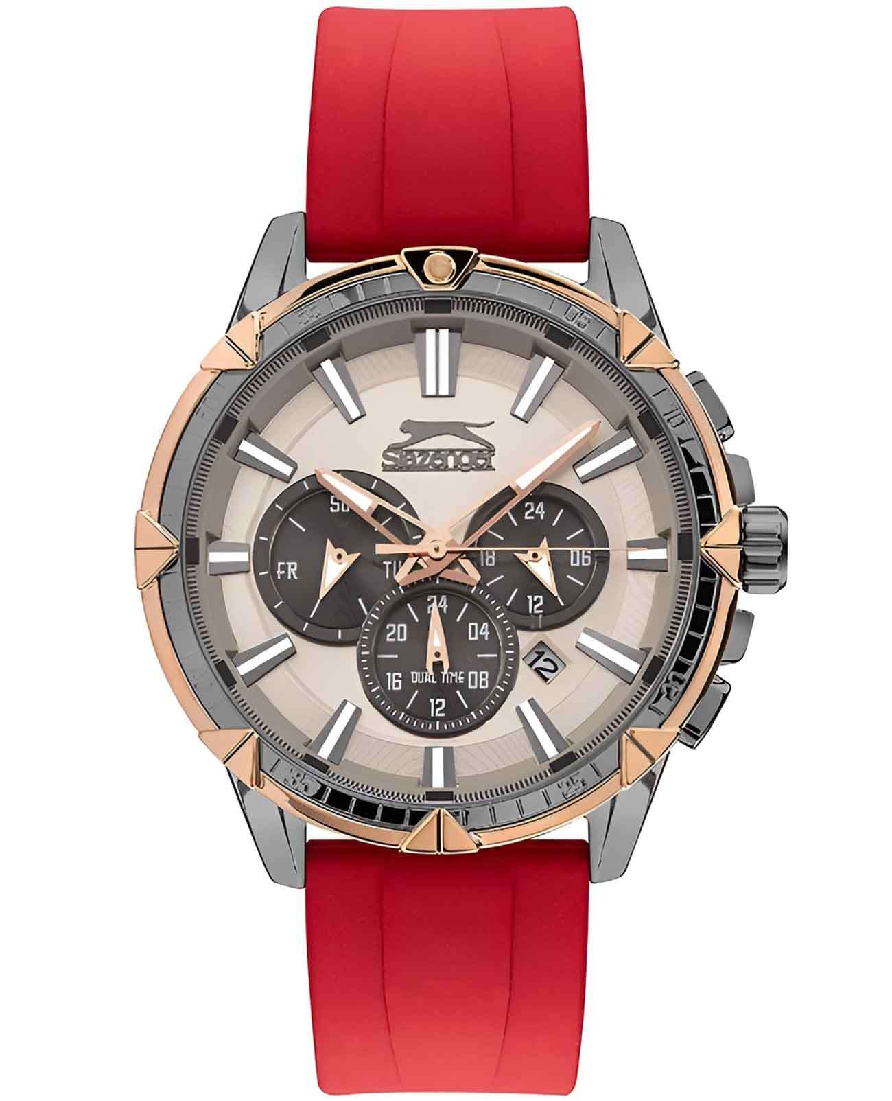 Мужские часы Slazenger SL.09.2090.2.03 представляют собой идеальное сочетание стиля и функциональности. Серебристый циферблат, обрамленный корпусом диаметром 46 мм и золотистым безелемБезельВнешний ободок, закрепляющий стекло. В спортивных часах так называется поворотное кольцо с делениями на циферблате, выполняет роль таймера – замеряет отрезки времени на шкале. Неподвижный безель – элемент декора. Однонаправленно вращающийся безель на дайверских часах позволяет фиксировать моменты погружения и выныривания на поверхность. из суперметалла и с IP-покрытиемIP-покрытиеМетод ионного напыления. Демонстрирует повышенную устойчивость к истиранию, окислению и химическим веществам. Под воздействием высокого давления и температуры около 1500°C молекулы металла надёжно соединяются с частицами корпуса часов., привлекает внимание своим современным дизайном. Кварцевый механизм обеспечивает точность хода. Силиконовый браслет красного цвета добавляет комфорта и надежности, идеально сочетаясь с цветом циферблата. Минеральное стеклоМинеральное стеклоМинеральное стекло представляет собой искусственно выращенный минерал кварца. Такое стекло отличается особой устойчивостью к повреждениям и царапинам. Уступает по некоторым качествам сапфировому стеклу. защищает часы от царапин, а люминесцентное покрытиеЛюминесцентное покрытиеПозволяет считывать показания времени в темноте. Производители наносят на стрелки, часовые индексы, безель или поверхность циферблата светонакопительный состав, дающий холодное свечение. на стрелках и метках обеспечивает видимость в темноте. Функциональность часов дополнена вторым часовым поясомВторой часовой поясФункция, позволяющая отображать время двух часовых поясов одновременно., 24-часовым указателем времени, календарем даты в районе отметки «4:30» и дня недели. А водозащита до 5 ATM позволяет использовать часы в различных условиях.