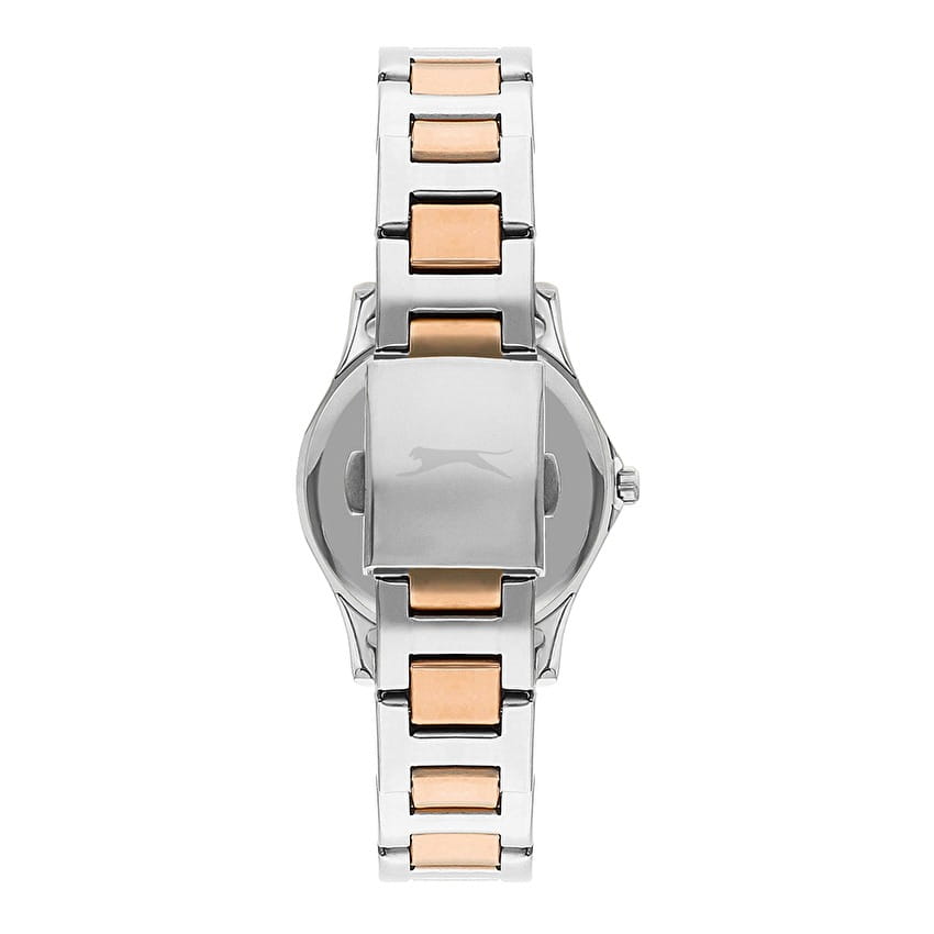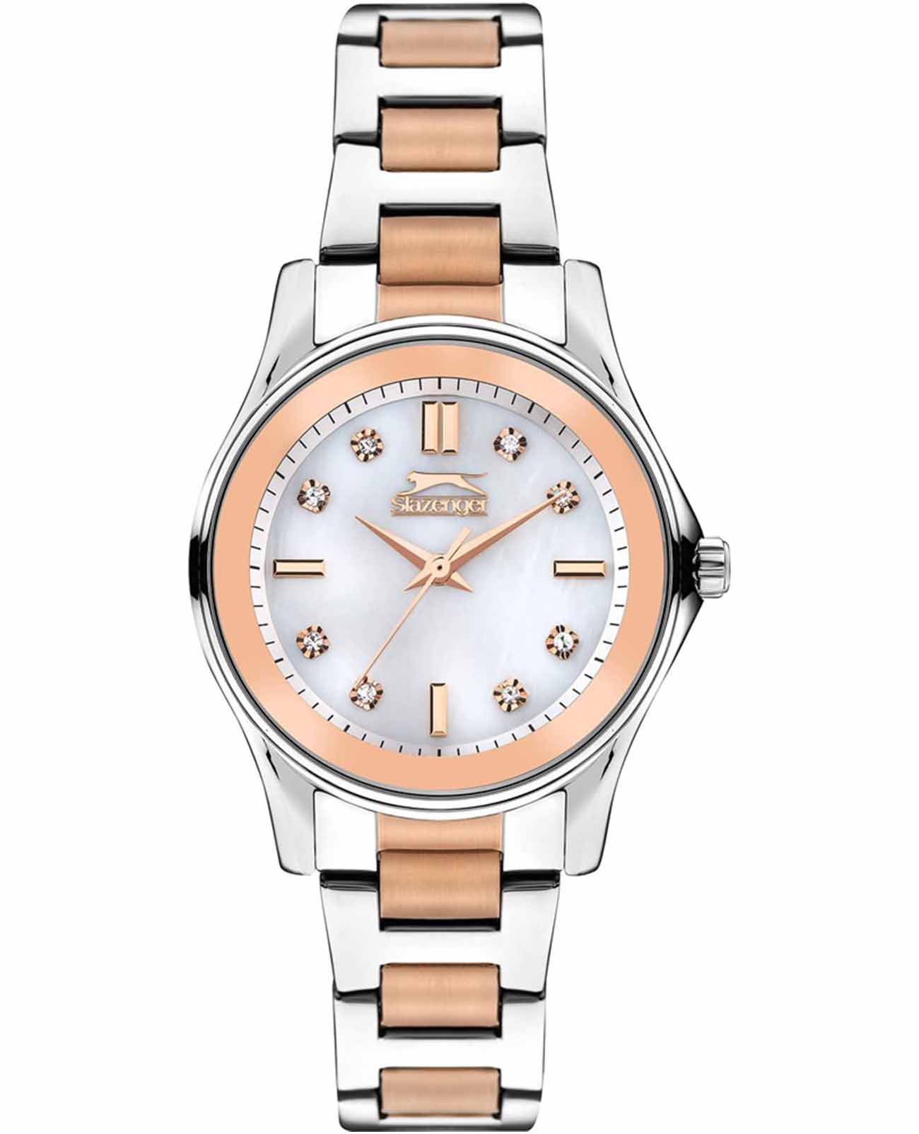 Женские наручные часы Slazenger SL.09.2235.3.02 сочетают в себе классический дизайн и надежность современных технологий. Модель обладает круглым корпусом диаметром 32 мм, изготовленным из прочного металла, что обеспечивает высокую устойчивость к внешним воздействиям. Индексы украшены фианитами. Браслет выполнен из металла с частичным розово-золотистым  IP-покрытиемIP-покрытиеМетод ионного напыления. Демонстрирует повышенную устойчивость к истиранию, окислению и химическим веществам. Под воздействием высокого давления и температуры около 1500°C молекулы металла надёжно соединяются с частицами корпуса часов. и с раскладной застёжкойРаскладная застёжкаТакой тип застёжки используется только на браслетах из металла. Она никогда не раскрывается полностью, происходит разделение на 2 и более частей. Раскладывающая застёжка снизит вероятность потери часов к минимуму., гарантирующей комфортное ношение и безопасность. Циферблат перламутрового белого цвета декорирован золотистыми стрелками и индексами. Для защиты используется минеральное стеклоМинеральное стеклоМинеральное стекло представляет собой искусственно выращенный минерал кварца. Такое стекло отличается особой устойчивостью к повреждениям и царапинам. Уступает по некоторым качествам сапфировому стеклу., обеспечивающее прочную защиту от царапин. Часы работают на кварцевом механизме, что гарантирует точное время без необходимости подзаводки. Водонепроницаемость часов достигает 3 атмосфер, что позволяет использовать их при мытье рук или хождении под мелким дождем, однако не рекомендуется для плавания или других водных видов спорта. Вес модели составляет 72 грамма.