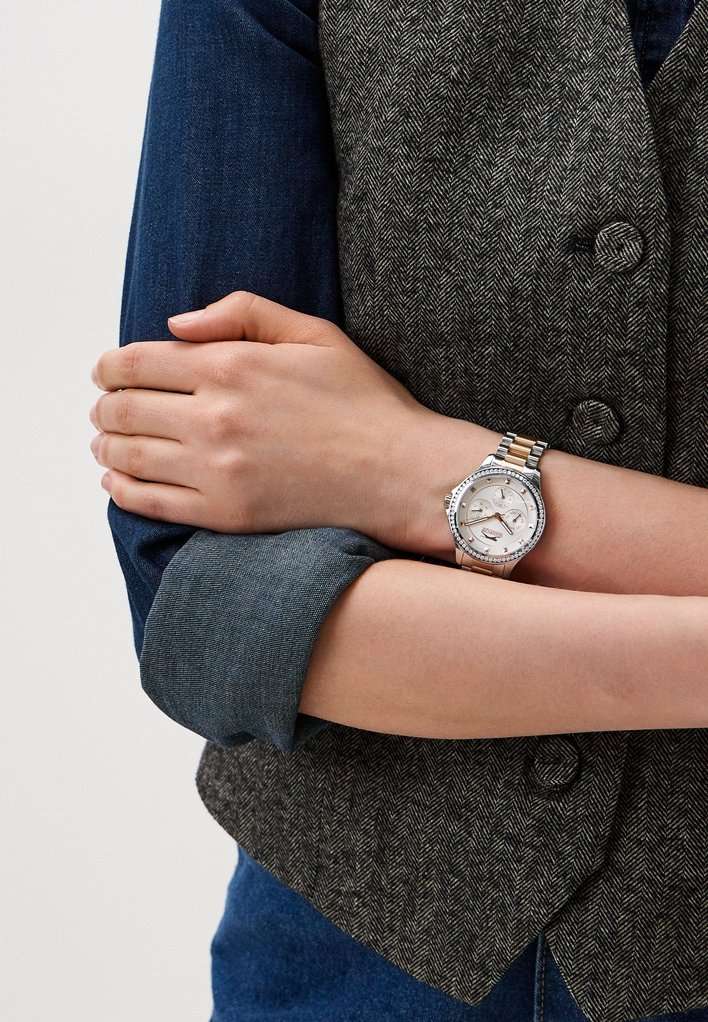 Эти женские часы Slazenger SL.09.2241.4.03 выполнены в современном стиле и станет элегантным дополнением к любому образу. Корпус и браслет изготовлены из прочного металла серебристого цвета, безельБезельВнешний ободок, закрепляющий стекло. В спортивных часах так называется поворотное кольцо с делениями на циферблате, выполняет роль таймера – замеряет отрезки времени на шкале. Неподвижный безель – элемент декора. Однонаправленно вращающийся безель на дайверских часах позволяет фиксировать моменты погружения и выныривания на поверхность. украшен изящными кристаллами, которые придают часам особую привлекательность. На циферблате расположены дополнительные малые циферблаты для отображения даты, дня недели и времени в 24-часовом формате, что делает их функциональными и удобными для ежедневного использования. Минеральное стеклоМинеральное стеклоМинеральное стекло представляет собой искусственно выращенный минерал кварца. Такое стекло отличается особой устойчивостью к повреждениям и царапинам. Уступает по некоторым качествам сапфировому стеклу. надежно защищает циферблат от царапин, а водозащита уровня WR 30 предохраняет механизм от случайных брызг воды. Заводная головка оснащена защитой, а стрелки имеют подсветку для легкого считывания времени в темноте. Диаметр корпуса составляет 34 мм, ширина браслета — 16 мм, толщина корпуса — 9 мм. Часы фиксируются на руке с помощью браслета из металла с частичным золотистым IP-покрытиемIP-покрытиеМетод ионного напыления. Демонстрирует повышенную устойчивость к истиранию, окислению и химическим веществам. Под воздействием высокого давления и температуры около 1500°C молекулы металла надёжно соединяются с частицами корпуса часов. удобной раскладной застёжкиРаскладная застёжкаТакой тип застёжки используется только на браслетах из металла. Она никогда не раскрывается полностью, происходит разделение на 2 и более частей. Раскладывающая застёжка снизит вероятность потери часов к минимуму.. Вес изделия подобран для комфортной ежедневной носки. Для удобства использования в темное время суток предусмотрено люминесцентное покрытиеЛюминесцентное покрытиеПозволяет считывать показания времени в темноте. Производители наносят на стрелки, часовые индексы, безель или поверхность циферблата светонакопительный состав, дающий холодное свечение. стрелок.