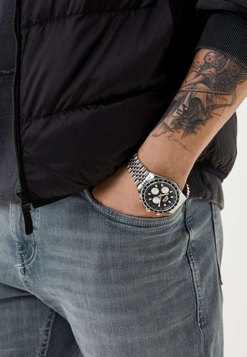 Часы Slazenger SL.09.2248.2.02 — это современная модель с выразительным спортивным характером, идеально подходящая для активного образа жизни. Корпус выполнен из прочного металла, синий циферблат защищён минеральным стекломМинеральное стеклоМинеральное стекло представляет собой искусственно выращенный минерал кварца. Такое стекло отличается особой устойчивостью к повреждениям и царапинам. Уступает по некоторым качествам сапфировому стеклу., устойчивым к царапинам. Часы также оснащены шкалой тахиметраТахиметрРазмеченная шкала, располагается на ободке или безеле часов. Тахиметр позволяет рассчитать скорость на определённом участке пути, расстояние измеряется в километрах или милях., что добавляет им функциональности и может быть полезно для измерения скорости. На безельБезельВнешний ободок, закрепляющий стекло. В спортивных часах так называется поворотное кольцо с делениями на циферблате, выполняет роль таймера – замеряет отрезки времени на шкале. Неподвижный безель – элемент декора. Однонаправленно вращающийся безель на дайверских часах позволяет фиксировать моменты погружения и выныривания на поверхность. нанесено синее IP-покрытиеIP-покрытиеМетод ионного напыления. Демонстрирует повышенную устойчивость к истиранию, окислению и химическим веществам. Под воздействием высокого давления и температуры около 1500°C молекулы металла надёжно соединяются с частицами корпуса часов.. Диаметр корпуса составляет 46 мм, толщина — 11 мм, а ширина браслета — 22 мм. Часы оснащены металлическим браслетом с надежной раскладной застёжкойРаскладная застёжкаТакой тип застёжки используется только на браслетах из металла. Она никогда не раскрывается полностью, происходит разделение на 2 и более частей. Раскладывающая застёжка снизит вероятность потери часов к минимуму., благодаря чему часы удобно сидят на руке и не вызывают дискомфорта даже при длительном ношении. Вес модели составляет 130 грамм. Надёжный кварцевый механизм обеспечивает точность времени, а уровень водозащиты WR 50 позволяет использовать часы в повседневных условиях, не опасаясь случайных брызг или дождя. Для удобства использования в темное время суток предусмотрено люминесцентное покрытиеЛюминесцентное покрытиеПозволяет считывать показания времени в темноте. Производители наносят на стрелки, часовые индексы, безель или поверхность циферблата светонакопительный состав, дающий холодное свечение. стрелок и меток. Дополнительные малые циферблаты показывают дату, день недели и текущее время в 24-часовом формате, что делает использование часов ещё более удобным и функциональным.