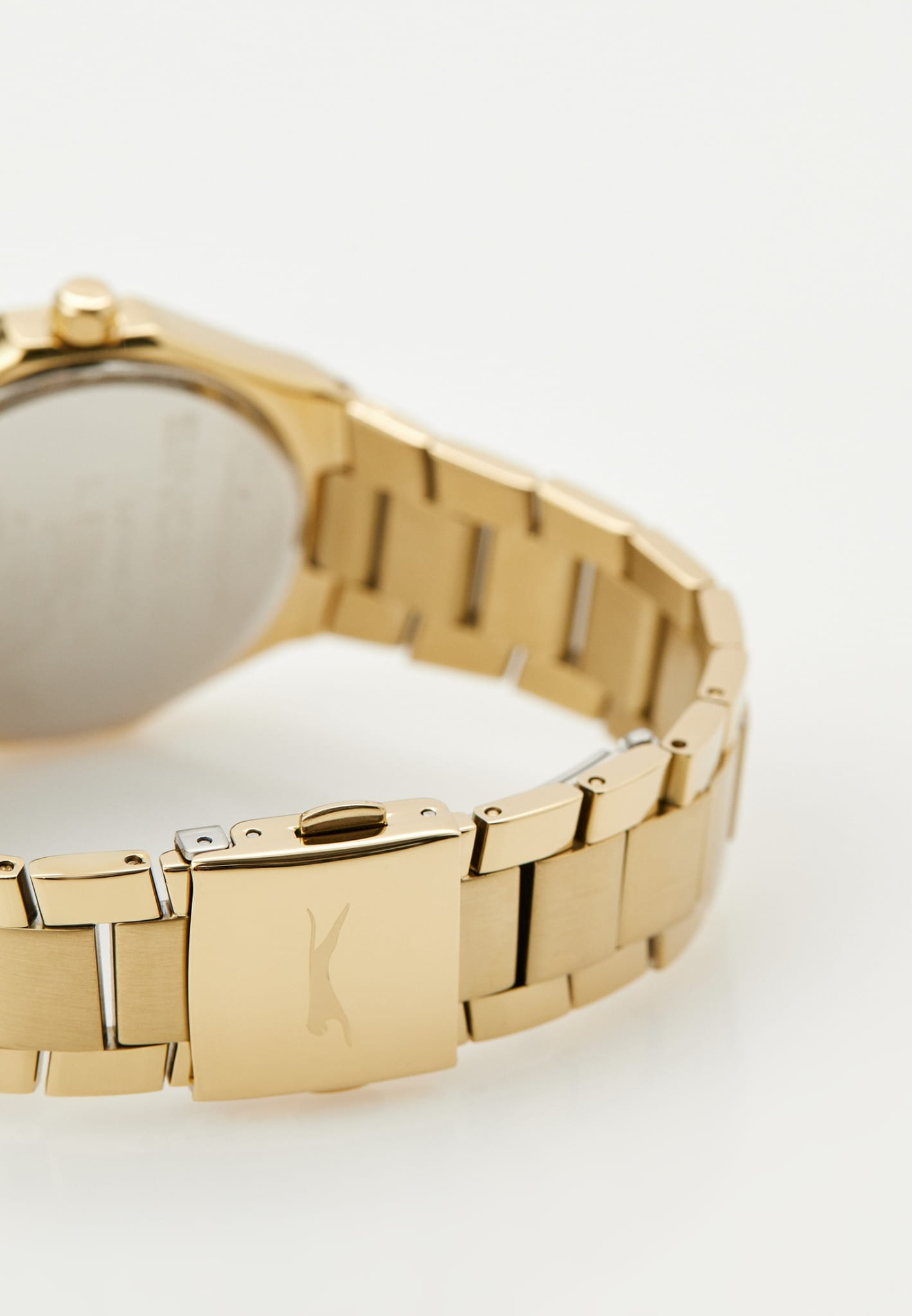 Часы Slazenger SL.09.2258.3.04 — это изысканный аксессуар, который гармонично подчеркнёт ваш индивидуальный стиль. Корпус и браслет выполнены из инновационного суперметалла с золотистым IP-покрытиемIP-покрытиеМетод ионного напыления. Демонстрирует повышенную устойчивость к истиранию, окислению и химическим веществам. Под воздействием высокого давления и температуры около 1500°C молекулы металла надёжно соединяются с частицами корпуса часов. — сплава на основе меди с пониженным содержанием цинка и никеля, обладающего специальным защитным покрытием, а циферблат украшен 4 кристаллами. Надёжный кварцевый механизм обеспечивает точный ход, а прочное минеральное стеклоМинеральное стеклоМинеральное стекло представляет собой искусственно выращенный минерал кварца. Такое стекло отличается особой устойчивостью к повреждениям и царапинам. Уступает по некоторым качествам сапфировому стеклу. устойчиво к царапинам и защищает зеленый циферблат от внешних воздействий. Диаметр корпуса составляет 38 мм, толщина — всего 8 мм, что делает модель элегантной и удобной для ежедневного ношения. Водонепроницаемость до 3 бар позволяет не беспокоиться о случайных брызгах или каплях дождя. Стрелки с люминесцентным покрытиемЛюминесцентное покрытиеПозволяет считывать показания времени в темноте. Производители наносят на стрелки, часовые индексы, безель или поверхность циферблата светонакопительный состав, дающий холодное свечение. удобно подсвечиваются в темноте после зарядки на свету. Стальной браслет с золотистым IP-покрытиемIP-покрытиеМетод ионного напыления. Демонстрирует повышенную устойчивость к истиранию, окислению и химическим веществам. Под воздействием высокого давления и температуры около 1500°C молекулы металла надёжно соединяются с частицами корпуса часов. и раскладной застёжкойРаскладная застёжкаТакой тип застёжки используется только на браслетах из металла. Она никогда не раскрывается полностью, происходит разделение на 2 и более частей. Раскладывающая застёжка снизит вероятность потери часов к минимуму. обеспечивает комфортную посадку. Часы станут отличным выбором как для повседневной жизни, так и для особых случаев, а также послужат прекрасным подарком на любой праздник.
