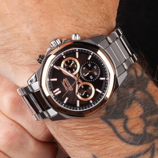 Часы Slazenger SL.09.2289.2.03 — это сочетание современного дизайна и функциональности, идеально подходящее для тех, кто ценит стиль и надежность. Корпус и браслет выполнены из прочного суперметалла, что придаёт модели солидный и эффектный вид. Черный циферблат с лаконичными отметками и фирменным логотипом защищён устойчивым к царапинам минеральным стекломМинеральное стеклоМинеральное стекло представляет собой искусственно выращенный минерал кварца. Такое стекло отличается особой устойчивостью к повреждениям и царапинам. Уступает по некоторым качествам сапфировому стеклу.. Дополнительные функции включают отображение даты и дня недели, а также 12- и 24-часовой формат времени на отдельных мини-циферблатах, что делает использование часов максимально удобным. Заводная головка оснащена защитой, а надёжная раскладная застёжкаРаскладная застёжкаТакой тип застёжки используется только на браслетах из металла. Она никогда не раскрывается полностью, происходит разделение на 2 и более частей. Раскладывающая застёжка снизит вероятность потери часов к минимуму. обеспечивает комфортную посадку на запястье. Особое внимание привлекает восьмигранный безельБезельВнешний ободок, закрепляющий стекло. В спортивных часах так называется поворотное кольцо с делениями на циферблате, выполняет роль таймера – замеряет отрезки времени на шкале. Неподвижный безель – элемент декора. Однонаправленно вращающийся безель на дайверских часах позволяет фиксировать моменты погружения и выныривания на поверхность. с розово-золотистым IP-покрытиемIP-покрытиеМетод ионного напыления. Демонстрирует повышенную устойчивость к истиранию, окислению и химическим веществам. Под воздействием высокого давления и температуры около 1500°C молекулы металла надёжно соединяются с частицами корпуса часов.. Циферблат оснащён люминесцентным покрытиемЛюминесцентное покрытиеПозволяет считывать показания времени в темноте. Производители наносят на стрелки, часовые индексы, безель или поверхность циферблата светонакопительный состав, дающий холодное свечение. стрелок и меток, что позволяет легко определять время даже в условиях плохой освещенности. Водозащита 50WR позволяет не беспокоиться о случайных брызгах и дождевых каплях. Диаметр корпуса составляет 46 мм, толщина — 14 мм, вес — 165 г, благодаря чему часы выглядят внушительно и подчёркивают индивидуальный стиль владельца. Эта модель станет отличным акцентом в вашем образе и подчеркнёт вашу уверенность в любой ситуации.