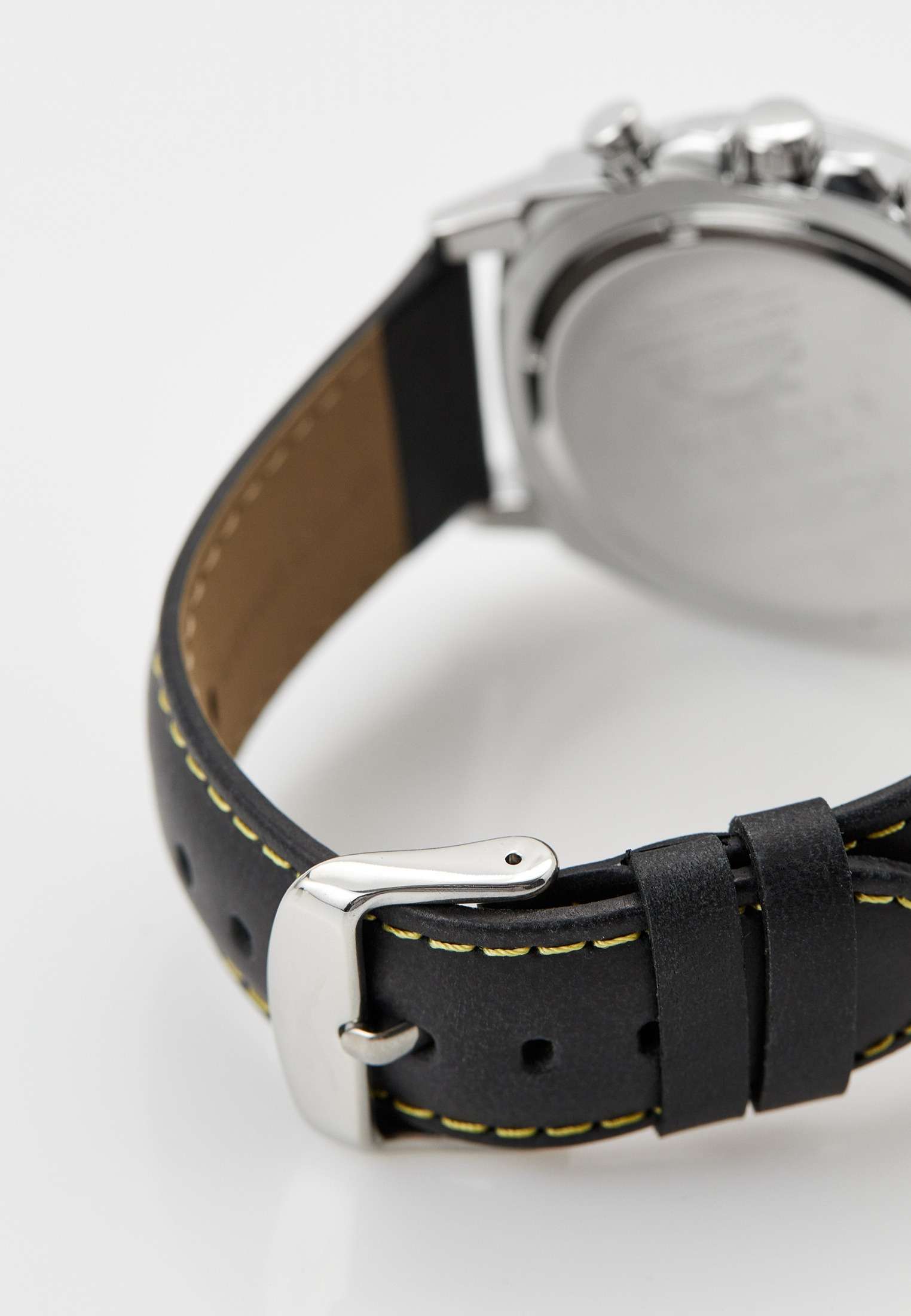 Slazenger SL.09.2293.2.05 — это стильные наручные часы, выполненные в современном дизайне и отлично подходящие для повседневного использования. Корпус диаметром 45 мм изготовлен из прочного металла и дополнен минеральным стекломМинеральное стеклоМинеральное стекло представляет собой искусственно выращенный минерал кварца. Такое стекло отличается особой устойчивостью к повреждениям и царапинам. Уступает по некоторым качествам сапфировому стеклу., которое защищает желтый циферблат. Черный кожаный ремешок шириной 24 мм оснащён надежной классической застежкой, которая обеспечивает комфортную посадку на руке. Кварцевый механизм гарантирует точный ход, а водозащита уровня WR 50 позволяет не снимать часы во время мытья рук или под дождём. Модель оснащена люминесцентным покрытиемЛюминесцентное покрытиеПозволяет считывать показания времени в темноте. Производители наносят на стрелки, часовые индексы, безель или поверхность циферблата светонакопительный состав, дающий холодное свечение. стрелок и меток, что облегчает считывание времени в темноте. Дополнительные малые циферблаты отображают дату, день недели и текущее время в 24-часовом формате. Часы также оснащены заводной головкой с защитой и безелемБезельВнешний ободок, закрепляющий стекло. В спортивных часах так называется поворотное кольцо с делениями на циферблате, выполняет роль таймера – замеряет отрезки времени на шкале. Неподвижный безель – элемент декора. Однонаправленно вращающийся безель на дайверских часах позволяет фиксировать моменты погружения и выныривания на поверхность. с черным IP-покрытиемIP-покрытиеМетод ионного напыления. Демонстрирует повышенную устойчивость к истиранию, окислению и химическим веществам. Под воздействием высокого давления и температуры около 1500°C молекулы металла надёжно соединяются с частицами корпуса часов. и секундной разметкой. Вес изделия составляет 80 грамм.