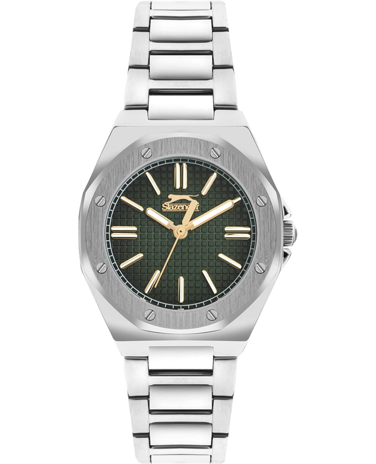 Женские кварцевые часы Slazenger SL.09.2306.3.02 — это элегантный и стильный аксессуар, идеально дополняющий любой образ. Корпус и браслет выполнены из суперметалла, защищён минеральным стекломМинеральное стеклоМинеральное стекло представляет собой искусственно выращенный минерал кварца. Такое стекло отличается особой устойчивостью к повреждениям и царапинам. Уступает по некоторым качествам сапфировому стеклу.. Циферблат зелёного цвета оформлен в классическом стиле, стрелки оснащены люминесцентным покрытиемЛюминесцентное покрытиеПозволяет считывать показания времени в темноте. Производители наносят на стрелки, часовые индексы, безель или поверхность циферблата светонакопительный состав, дающий холодное свечение., обеспечивающим хорошую читаемость в темноте. Заводная головка снабжена защитой для повышения надёжности. Браслет из суперметалла фиксируется на раскладной застёжкеРаскладная застёжкаТакой тип застёжки используется только на браслетах из металла. Она никогда не раскрывается полностью, происходит разделение на 2 и более частей. Раскладывающая застёжка снизит вероятность потери часов к минимуму., обеспечивая удобство и безопасность ношения. Водонепроницаемость 30 м позволяет использовать часы в повседневных условиях, защищая от случайных брызг и капель дождя. Модель сочетает в себе лёгкость, прочность и изысканный внешний вид.