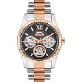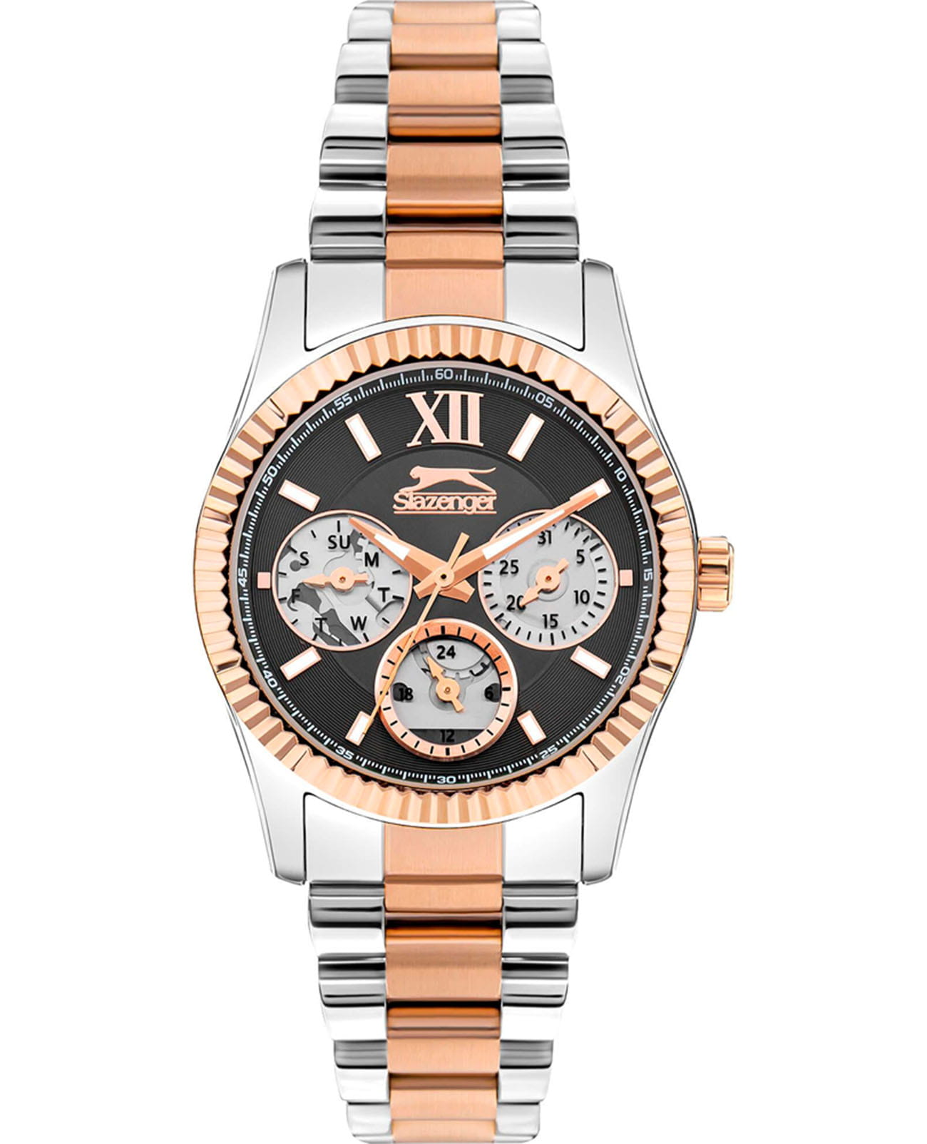 Женские кварцевые часы Slazenger SL.09.2317.4.04 — это выразительный и функциональный аксессуар, сочетающий стиль, прочность и насыщенную комплектацию. Безель и браслет выполнены из суперметалла с частичным IP-покрытиемIP-покрытиеМетод ионного напыления. Демонстрирует повышенную устойчивость к истиранию, окислению и химическим веществам. Под воздействием высокого давления и температуры около 1500°C молекулы металла надёжно соединяются с частицами корпуса часов.. Циферблат чёрного цвета защищён минеральным стекломМинеральное стеклоМинеральное стекло представляет собой искусственно выращенный минерал кварца. Такое стекло отличается особой устойчивостью к повреждениям и царапинам. Уступает по некоторым качествам сапфировому стеклу. и оформлен с вынесенными малыми циферблатами для индикации дня недели, даты и времени в 24-часовом формате. Стрелки и метки оснащены люминесцентным покрытиемЛюминесцентное покрытиеПозволяет считывать показания времени в темноте. Производители наносят на стрелки, часовые индексы, безель или поверхность циферблата светонакопительный состав, дающий холодное свечение., обеспечивающим хорошую читаемость в темноте. Браслет комбинированного цвета фиксируется на раскладной застёжкеРаскладная застёжкаТакой тип застёжки используется только на браслетах из металла. Она никогда не раскрывается полностью, происходит разделение на 2 и более частей. Раскладывающая застёжка снизит вероятность потери часов к минимуму., обеспечивая удобство и надёжность ношения. Водонепроницаемость 30 м позволяет использовать часы в повседневных условиях, защищая от случайных брызг и капель дождя. Модель подчёркивает индивидуальность владельца и идеально подходит как для повседневного, так и для торжественного образа.