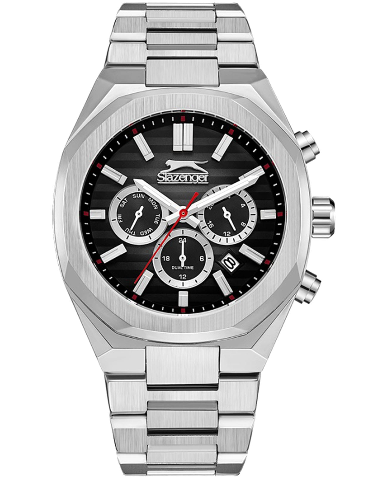 Мужские кварцевые часы Slazenger SL.09.2345.2.01 – идеальное сочетание классического дизайна и современных технологий, созданное для уверенных в себе мужчин. Корпус выполнен из суперметалла серебристого цвета, диаметром 43 мм и толщиной 12 мм, подчёркивает надежность модели и делает их идеальным аксессуаром для любой ситуации – будь то деловая встреча или повседневные выходы. Циферблат надёжно защищён минеральным стекломМинеральное стеклоМинеральное стекло представляет собой искусственно выращенный минерал кварца. Такое стекло отличается особой устойчивостью к повреждениям и царапинам. Уступает по некоторым качествам сапфировому стеклу., которое устойчиво к механическим повреждениям и сохраняет кристальную прозрачность. Браслет из суперметалла удобно облегает запястье и фиксируется с помощью раскладной застёжкиРаскладная застёжкаТакой тип застёжки используется только на браслетах из металла. Она никогда не раскрывается полностью, происходит разделение на 2 и более частей. Раскладывающая застёжка снизит вероятность потери часов к минимуму., обеспечивая надёжность и комфорт в повседневном ношении. Стрелки и метки покрыты люминесцентным покрытиемЛюминесцентное покрытиеПозволяет считывать показания времени в темноте. Производители наносят на стрелки, часовые индексы, безель или поверхность циферблата светонакопительный состав, дающий холодное свечение., обеспечивающим отличную читаемость в темноте. Эти часы станут не просто аксессуаром, а надежным спутником в любой ситуации, подчеркивая ваш безупречный вкус и деловой стиль. Окошко даты находится в положении между 4 и 5 часов. Вынесенный циферблат с 24-х часовым указателем времени. Водозащита до 50 метров позволит защитить корпус от случайных брызг или капель дождя. Функция GMTGMTОтображение времени второго часового пояса.Такая функция особенно актуальна для путешественников и бизнесменов,которые общаются с людьми из разных стран,теперь вы всегда будете знать,какой час у вашего партнёра или близкого человека. поможет отслеживать время второго часового поясаВторой часовой поясФункция, позволяющая отображать время двух часовых поясов одновременно..