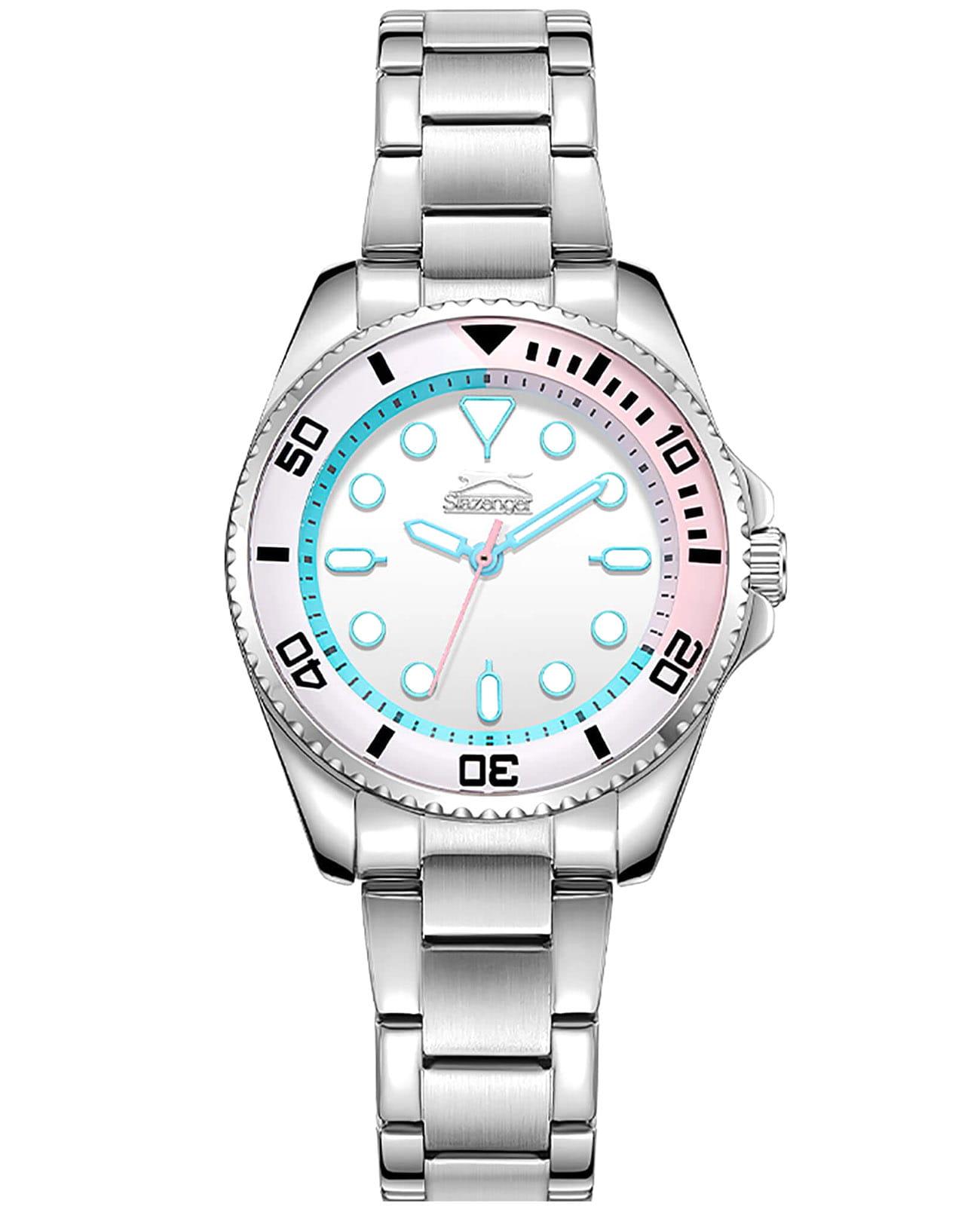 Женские кварцевые часы Slazenger SL.09.2353.3.07 – это сочетание элегантности, современного стиля и надёжности. Изящный корпус из суперметалла серебристого цвета, диаметром 32 мм и толщиной 10 мм, подчёркивает утончённость модели и делает их идеальным аксессуаром для любой ситуации – будь то деловая встреча, романтический вечер или повседневные выходы. Циферблат надёжно защищён минеральным стекломМинеральное стеклоМинеральное стекло представляет собой искусственно выращенный минерал кварца. Такое стекло отличается особой устойчивостью к повреждениям и царапинам. Уступает по некоторым качествам сапфировому стеклу., которое устойчиво к механическим повреждениям и сохраняет кристальную прозрачность. Браслет из суперметалла удобно облегает запястье и фиксируется с помощью раскладной застёжкиРаскладная застёжкаТакой тип застёжки используется только на браслетах из металла. Она никогда не раскрывается полностью, происходит разделение на 2 и более частей. Раскладывающая застёжка снизит вероятность потери часов к минимуму., обеспечивая надёжность и комфорт в повседневном ношении. Утончённый стиль, внимание к деталям и практичность делают эту модель идеальным выбором для современных женщин, ценящих эстетику и функциональность. Поворотный безельБезельВнешний ободок, закрепляющий стекло. В спортивных часах так называется поворотное кольцо с делениями на циферблате, выполняет роль таймера – замеряет отрезки времени на шкале. Неподвижный безель – элемент декора. Однонаправленно вращающийся безель на дайверских часах позволяет фиксировать моменты погружения и выныривания на поверхность. с IP-покрытиемIP-покрытиеМетод ионного напыления. Демонстрирует повышенную устойчивость к истиранию, окислению и химическим веществам. Под воздействием высокого давления и температуры около 1500°C молекулы металла надёжно соединяются с частицами корпуса часов.. Стрелки и метки покрыты люминесцентным покрытиемЛюминесцентное покрытиеПозволяет считывать показания времени в темноте. Производители наносят на стрелки, часовые индексы, безель или поверхность циферблата светонакопительный состав, дающий холодное свечение., обеспечивающим отличную читаемость в темноте. Водозащита до 30 метров позволит защитить корпус от случайных брызг или капель дождя.