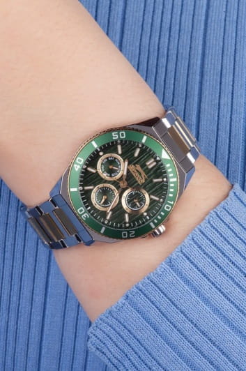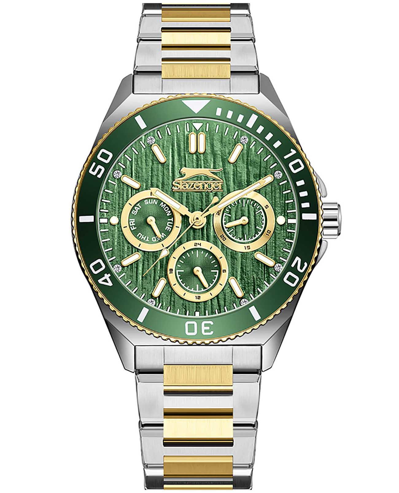 Женские кварцевые часы Slazenger SL.09.2371.2.05 – это сочетание элегантности, современного стиля и надёжности. Изящный корпус из суперметалла серебристого цвета, диаметром 38.5 мм и толщиной 11 мм, подчёркивает утончённость модели и делает их идеальным аксессуаром для любой ситуации – будь то деловая встреча, романтический вечер или повседневные выходы. Циферблат надёжно защищён минеральным стекломМинеральное стеклоМинеральное стекло представляет собой искусственно выращенный минерал кварца. Такое стекло отличается особой устойчивостью к повреждениям и царапинам. Уступает по некоторым качествам сапфировому стеклу., которое устойчиво к механическим повреждениям и сохраняет кристальную прозрачность. БезельБезельВнешний ободок, закрепляющий стекло. В спортивных часах так называется поворотное кольцо с делениями на циферблате, выполняет роль таймера – замеряет отрезки времени на шкале. Неподвижный безель – элемент декора. Однонаправленно вращающийся безель на дайверских часах позволяет фиксировать моменты погружения и выныривания на поверхность. с IP-покрытиемIP-покрытиеМетод ионного напыления. Демонстрирует повышенную устойчивость к истиранию, окислению и химическим веществам. Под воздействием высокого давления и температуры около 1500°C молекулы металла надёжно соединяются с частицами корпуса часов. зеленого цвета. Браслет из суперметалла с частичным IP-покрытиемIP-покрытиеМетод ионного напыления. Демонстрирует повышенную устойчивость к истиранию, окислению и химическим веществам. Под воздействием высокого давления и температуры около 1500°C молекулы металла надёжно соединяются с частицами корпуса часов. удобно облегает запястье и фиксируется с помощью раскладной застёжкиРаскладная застёжкаТакой тип застёжки используется только на браслетах из металла. Она никогда не раскрывается полностью, происходит разделение на 2 и более частей. Раскладывающая застёжка снизит вероятность потери часов к минимуму., обеспечивая надёжность и комфорт в повседневном ношении. Утончённый стиль, внимание к деталям и практичность делают эту модель идеальным выбором для современных женщин, ценящих эстетику и функциональность. Стрелки и метки покрыты люминесцентным покрытиемЛюминесцентное покрытиеПозволяет считывать показания времени в темноте. Производители наносят на стрелки, часовые индексы, безель или поверхность циферблата светонакопительный состав, дающий холодное свечение., обеспечивающим отличную читаемость в темноте. Вынесенный циферблат с 24-х часовым указателем времени украшен фианитами. Водозащита до 30 метров позволит защитить корпус от случайных брызг или капель дождя.