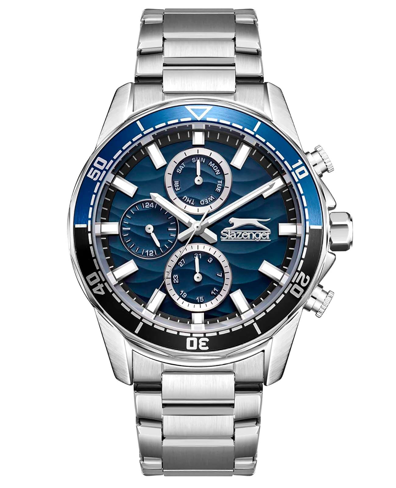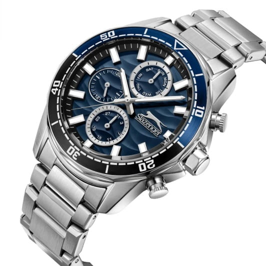 Мужские кварцевые часы Slazenger — это выразительный и функциональный аксессуар. Корпус диаметром 41,5 мм и толщиной 13 мм выполнен из суперметалла. Циферблат синего цвета оформлен индексами и стрелками. Циферблат защищён минеральным стекломМинеральное стеклоМинеральное стекло представляет собой искусственно выращенный минерал кварца. Такое стекло отличается особой устойчивостью к повреждениям и царапинам. Уступает по некоторым качествам сапфировому стеклу.. Механизм — кварцевый. Часы оснащены индикацией дня недели, даты и 12/24-часового формата времени. Стрелки и метки с люминесцентным покрытиемЛюминесцентное покрытиеПозволяет считывать показания времени в темноте. Производители наносят на стрелки, часовые индексы, безель или поверхность циферблата светонакопительный состав, дающий холодное свечение., обеспечивающим хорошую читаемость в темноте. Часы оснащены браслетом из суперметалла с раскладной застёжкойРаскладная застёжкаТакой тип застёжки используется только на браслетах из металла. Она никогда не раскрывается полностью, происходит разделение на 2 и более частей. Раскладывающая застёжка снизит вероятность потери часов к минимуму.. Водонепроницаемость 100 м позволяет использовать часы для плавания и повседневного ношения. Гарантия — 12 месяцев. Идеальный выбор для тех, кто ценит стиль, функциональность и качество.