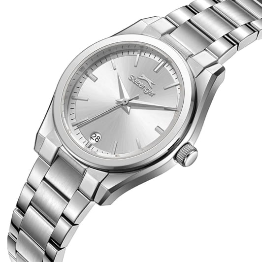 Женские кварцевые часы Slazenger — это элегантный аксессуар. Корпус диаметром 32 мм и толщиной 8 мм выполнен из суперметалла. Циферблат серебристого цвета оформлен индексами и стрелками. Циферблат защищён минеральным стекломМинеральное стеклоМинеральное стекло представляет собой искусственно выращенный минерал кварца. Такое стекло отличается особой устойчивостью к повреждениям и царапинам. Уступает по некоторым качествам сапфировому стеклу.. Механизм — кварцевый. Окошко даты расположено в положении 6 часов. Часы оснащены браслетом из суперметалла на застёжке «бабочка» с кнопкамиЗастёжка "бабочка"Такой вид застёжки дополняется предохранителями, помогающими избежать случайного раскрытия браслета. Обладают изящным исполнением. . Водонепроницаемость 50 м позволяет использовать часы в повседневных условиях. Гарантия — 12 месяцев. Идеальный выбор для тех, кто ценит стиль и качество.