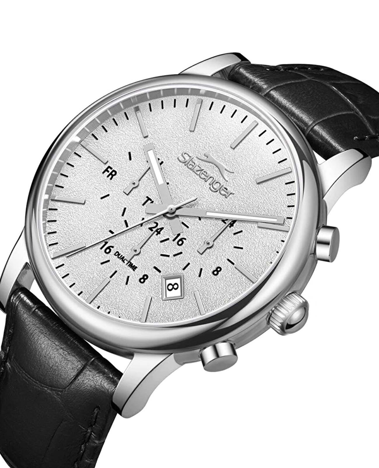 Мужские кварцевые часы Slazenger — это выразительный и функциональный аксессуар. Корпус диаметром 43 мм и толщиной 12 мм выполнен из нержавеющей стали 316L. Циферблат серебристого цвета оформлен индексами и стрелками. Циферблат защищён минеральным стекломМинеральное стеклоМинеральное стекло представляет собой искусственно выращенный минерал кварца. Такое стекло отличается особой устойчивостью к повреждениям и царапинам. Уступает по некоторым качествам сапфировому стеклу.. Стрелки с люминесцентным покрытиемЛюминесцентное покрытиеПозволяет считывать показания времени в темноте. Производители наносят на стрелки, часовые индексы, безель или поверхность циферблата светонакопительный состав, дающий холодное свечение., обеспечивающим хорошую читаемость в темноте. Механизм — кварцевый. Часы оснащены индикацией дня недели, даты, 12/24-часового формата времени и функцией второго часового пояса (GMT)Второй часовой поясФункция, позволяющая отображать время двух часовых поясов одновременно.. Окошко даты расположено между 4 и 5 часами. Часы оснащены кожаным ремешком с стандартной застёжкой. Водонепроницаемость 100 м позволяет использовать часы для плавания и повседневного ношения. Гарантия — 12 месяцев. Идеальный выбор для тех, кто ценит стиль, функциональность и качество.