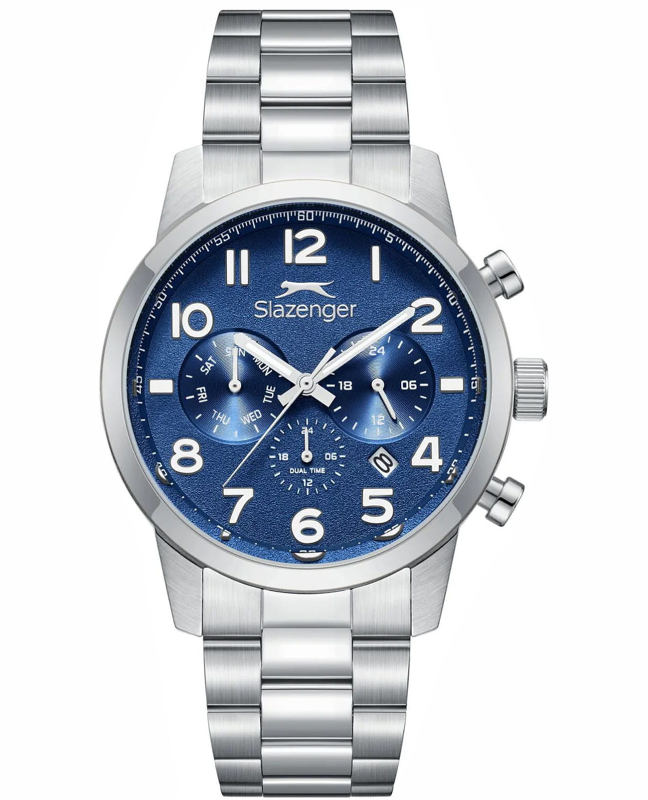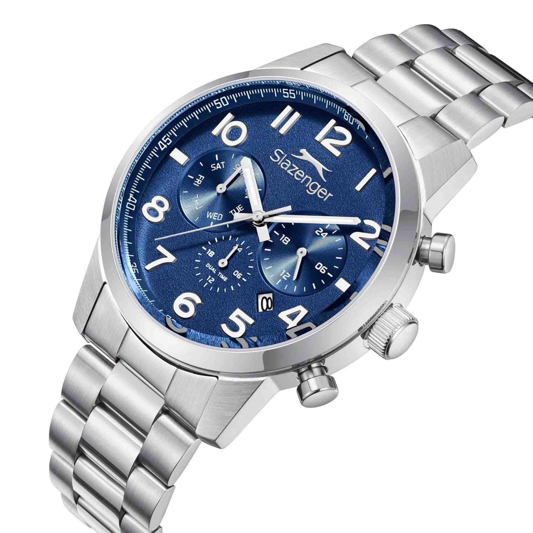 Мужские кварцевые часы Slazenger — это выразительный и функциональный аксессуар. Корпус диаметром 42 мм и толщиной 12 мм выполнен из нержавеющей стали 316L. Циферблат синего цвета оформлен индексами и стрелками. Окошко даты расположено на отметке в 6 часов. Указатель дня недели и 24-часовой формат времени вынесены на отдельные субциферблаты. Циферблат защищён минеральным стекломМинеральное стеклоМинеральное стекло представляет собой искусственно выращенный минерал кварца. Такое стекло отличается особой устойчивостью к повреждениям и царапинам. Уступает по некоторым качествам сапфировому стеклу.. Механизм — кварцевый калибр JP25. Часы оснащены функцией второго часового пояса (GMT)Второй часовой поясФункция, позволяющая отображать время двух часовых поясов одновременно.. Стрелки и метки с люминесцентным покрытиемЛюминесцентное покрытиеПозволяет считывать показания времени в темноте. Производители наносят на стрелки, часовые индексы, безель или поверхность циферблата светонакопительный состав, дающий холодное свечение., обеспечивающим хорошую читаемость в темноте. Часы оснащены стальным браслетом с раскладной застёжкойРаскладная застёжкаТакой тип застёжки используется только на браслетах из металла. Она никогда не раскрывается полностью, происходит разделение на 2 и более частей. Раскладывающая застёжка снизит вероятность потери часов к минимуму.. Водонепроницаемость 100 м позволяет использовать часы для плавания и повседневного ношения. Гарантия — 12 месяцев. Идеальный выбор для тех, кто ценит стиль, функциональность и качество.