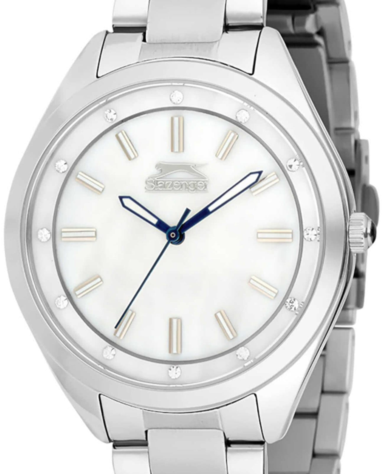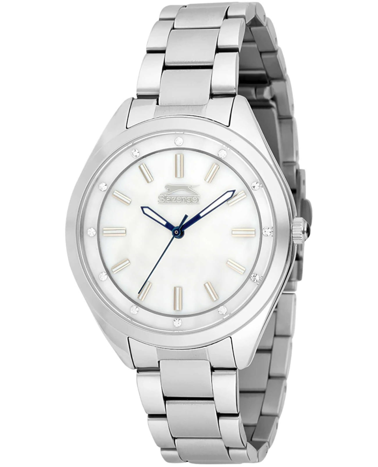 Женские кварцевые часы Slazenger — это элегантный аксессуар, который станет отличным дополнением к стилю. Корпус диаметром 36 мм и толщиной 8 мм выполнен из суперметалла. Циферблат белого цвета оформлен индексами в виде фианитов. Циферблат защищён минеральным стекломМинеральное стеклоМинеральное стекло представляет собой искусственно выращенный минерал кварца. Такое стекло отличается особой устойчивостью к повреждениям и царапинам. Уступает по некоторым качествам сапфировому стеклу.. Механизм — кварцевый калибр Miyota 2035. Часы оснащены браслетом из суперметалла на раскладной застёжкеРаскладная застёжкаТакой тип застёжки используется только на браслетах из металла. Она никогда не раскрывается полностью, происходит разделение на 2 и более частей. Раскладывающая застёжка снизит вероятность потери часов к минимуму.. Водонепроницаемость 30 м позволяет использовать часы в повседневных условиях. Идеальный выбор для тех, кто ценит стиль и качество.