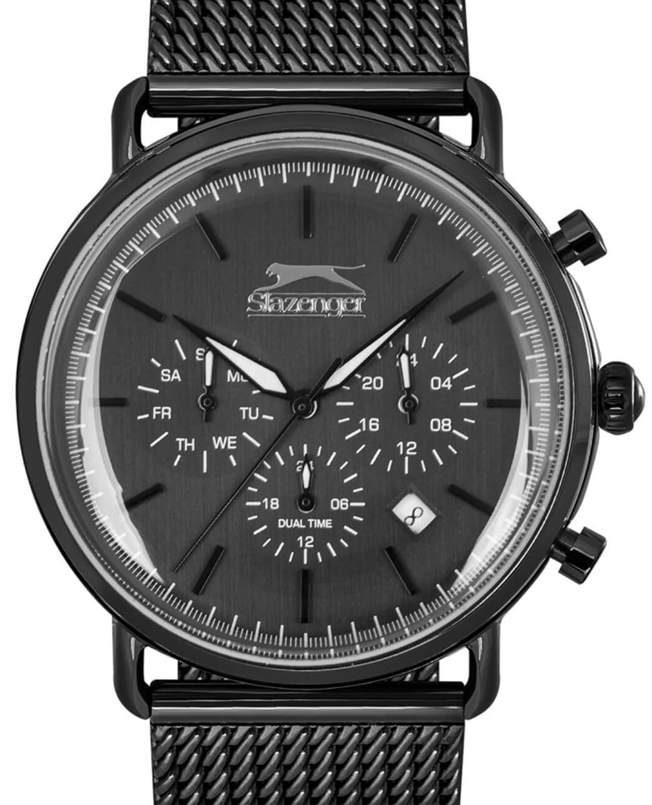 Мужские кварцевые часы Slazenger — стильный и функциональный аксессуар для современного мужчины. Корпус диаметром 43 мм выполнен из суперметалла с IP-покрытиемIP-покрытиеМетод ионного напыления. Демонстрирует повышенную устойчивость к истиранию, окислению и химическим веществам. Под воздействием высокого давления и температуры около 1500°C молекулы металла надёжно соединяются с частицами корпуса часов.. Циферблат чёрного цвета оформлен индексами и стрелками. Указатели дня недели и даты вынесены на отдельные субциферблаты, также присутствует индикация 24-часового формата времени. Стрелки с люминесцентным покрытиемЛюминесцентное покрытиеПозволяет считывать показания времени в темноте. Производители наносят на стрелки, часовые индексы, безель или поверхность циферблата светонакопительный состав, дающий холодное свечение., обеспечивающим хорошую читаемость в темноте. Циферблат защищён минеральным стекломМинеральное стеклоМинеральное стекло представляет собой искусственно выращенный минерал кварца. Такое стекло отличается особой устойчивостью к повреждениям и царапинам. Уступает по некоторым качествам сапфировому стеклу.. Механизм — кварцевый. Часы оснащены браслетом из суперметалла с раскладной застёжкойРаскладная застёжкаТакой тип застёжки используется только на браслетах из металла. Она никогда не раскрывается полностью, происходит разделение на 2 и более частей. Раскладывающая застёжка снизит вероятность потери часов к минимуму.. Водонепроницаемость 50 м позволяет использовать часы в повседневных условиях. Надёжный выбор для тех, кто ценит точность, технологии и уверенный стиль.