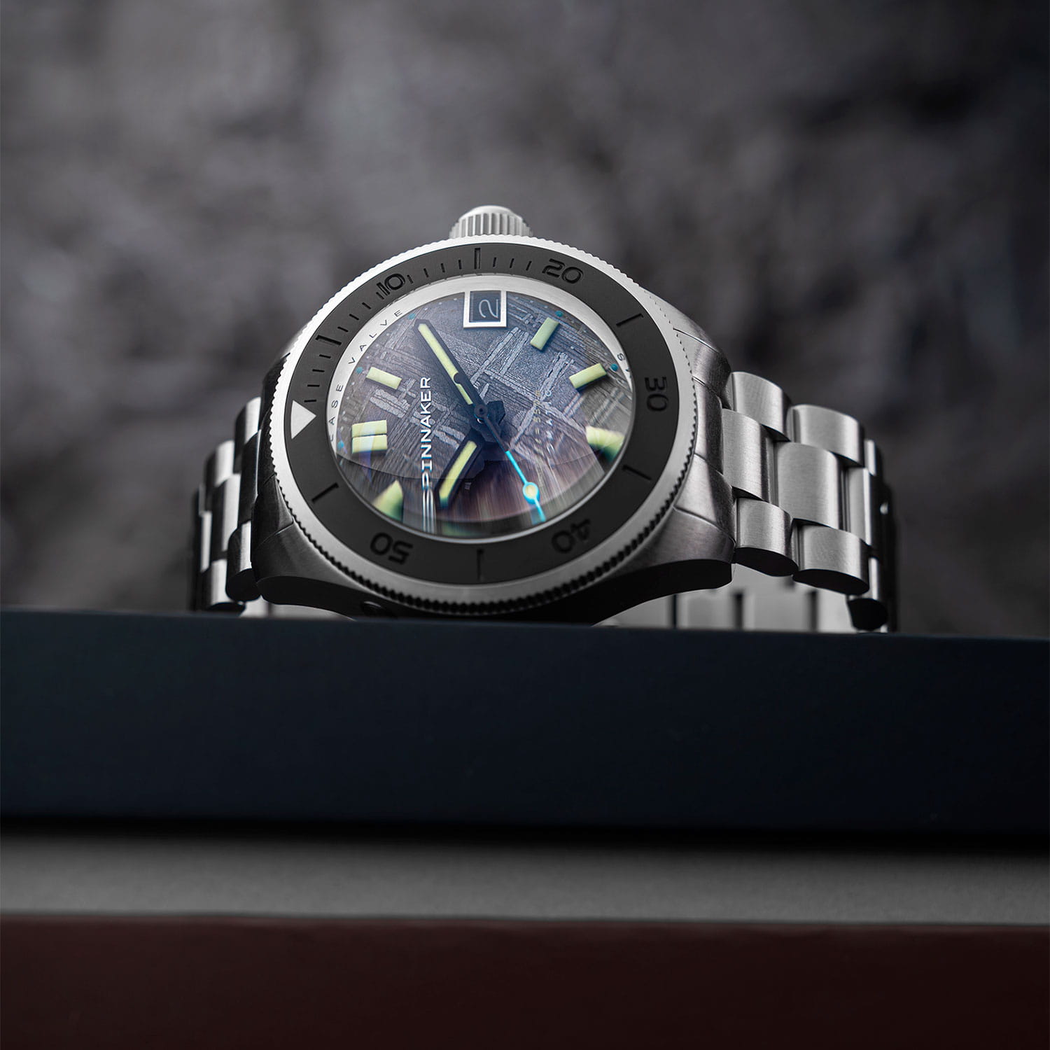 Часы Spinnaker Piccard Automatic Meteorite Limited Edition SP-5098-88 — уникальная модель, сочетающая глубоководные исследования и таинственность космоса. Циферблат изготовлен из фрагмента метеорита Muonionalusta, впервые обнаруженного в Швеции в 1906 году и предположительно упавшего на Землю более миллиона лет назад. Корпус выполнен из морской нержавеющей стали 316L, защищён сапфировым стекломСапфировое стеклоПрочный и надёжный материал из кристалла сапфира синтетического происхождения, характеризующийся особой твёрдостью и устойчивостью к царапинам и повреждениям. с выпуклой формой и антибликовым покрытием. Безель однонаправленный с . Модель оснащена автоматическим механизмом и рассчитана на водозащиту до 550 метров. Для удобства в глубоководных погружениях часы оснащены гелиевым выпускным клапаном. Браслет из нержавеющей стали с раскладной застёжкойРаскладная застёжкаТакой тип застёжки используется только на браслетах из металла. Она никогда не раскрывается полностью, происходит разделение на 2 и более частей. Раскладывающая застёжка снизит вероятность потери часов к минимуму. с предохранителем и кнопкой обеспечивает надёжную фиксацию. Эта модель выпущена ограниченной серией в 50 экземпляров, что подчёркивает её эксклюзивность и высокое качество исполнения.