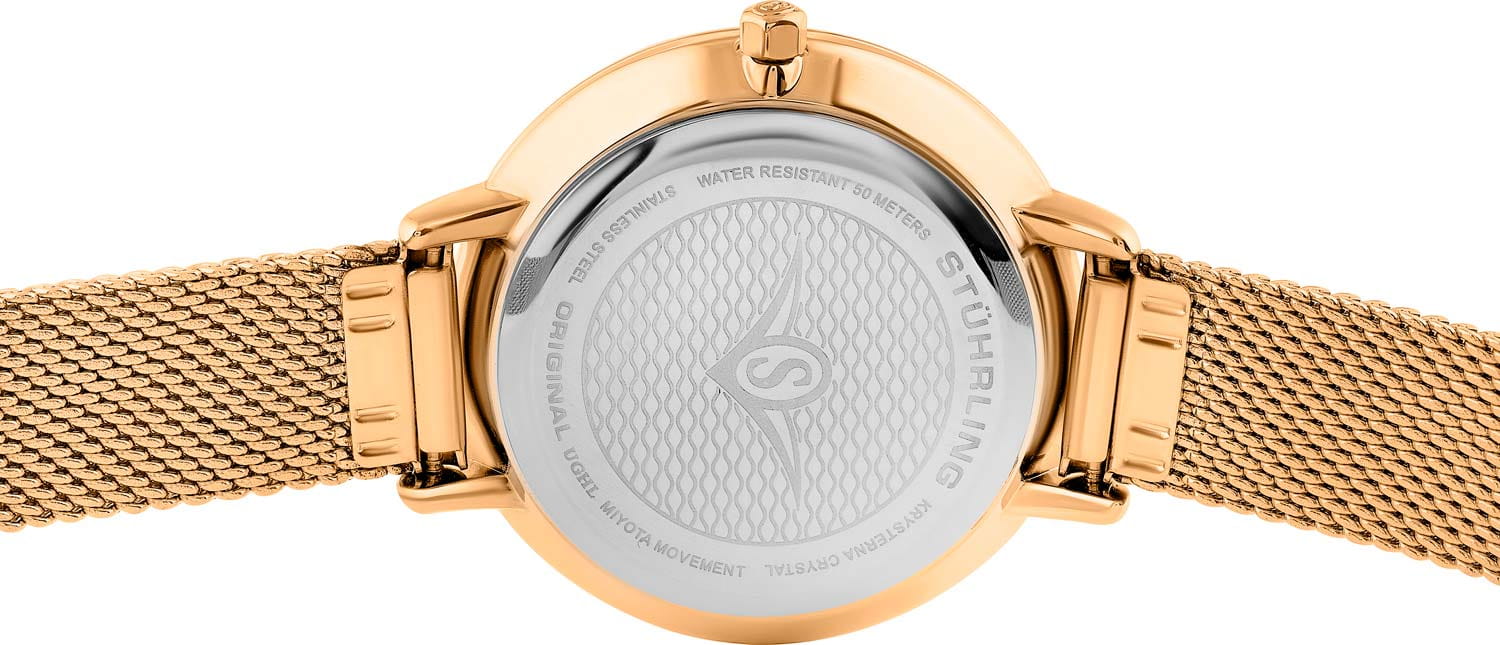 Stuhrling 3946.5 — элегантные женские часы, объединяющие строгую классику и современную функциональность. Корпус из нержавеющей стали с PVD-покрытиемPVDУльтратонкое покрытие наносится в технике вакуумного напыления, сочетает в себе нитрид титана особой прочности со слоем золота или оксида хрома. Несёт в себе декоративную или защитную функцию. создают ощущение монолитной надёжности, а глубокий циферблат украшенный кристаллом придаёт модели выразительность и характер. Стальной браслет миланского плетения с PVD-покрытиемPVDУльтратонкое покрытие наносится в технике вакуумного напыления, сочетает в себе нитрид титана особой прочности со слоем золота или оксида хрома. Несёт в себе декоративную или защитную функцию. на раскладном замкеРаскладной замокДанный вариант застежки используется только на часах с металлическим браслетом. Отличительная особенность такого крепления в том, что длина браслета становится универсальной и вы можете самостоятельно отрегулировать нужный вам размер – застежка просто двигается по браслету часов.. Прочное стекло KrysternaKrysternaKrysterna — инновационное стекло для наручных часов. Благодаря уникальной структуре, Krysterna объединяет ключевые преимущества двух материалов: твердость сапфира, защищающую от царапин, и гибкость минерального стекла, обеспечивающую устойчивость к деформациям. Такая комбинация делает его идеальным решением для часов, подверженных экстремальным нагрузкам, сохраняя при этом оптическую прозрачность. защищает циферблат от царапин, а надёжный кварцевый механизм гарантирует стабильную точность. Stuhrling — выбор уверенной девушки, ценящей сочетание функциональности, лаконичного дизайна и безупречной отделки.