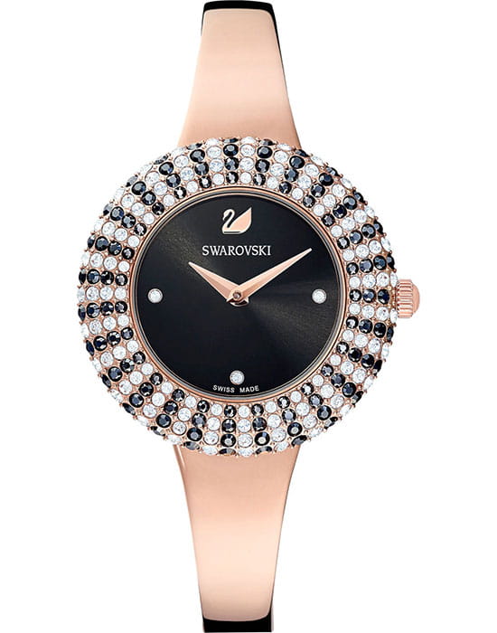 Женские часы Swarovski Crystal Rose 5484050 – это элегантные и утончённые часы, отличающиеся непревзойдённым сиянием. БезельБезельВнешний ободок, закрепляющий стекло. В спортивных часах так называется поворотное кольцо с делениями на циферблате, выполняет роль таймера – замеряет отрезки времени на шкале. Неподвижный безель – элемент декора. Однонаправленно вращающийся безель на дайверских часах позволяет фиксировать моменты погружения и выныривания на поверхность. украшен микропаве из 215 кристаллов. Завершающие штрихи уникального дизайна – корпус и браслет из нержавеющей стали с PVDPVDУльтратонкое покрытие наносится в технике вакуумного напыления, сочетает в себе нитрид титана особой прочности со слоем золота или оксида хрома. Несёт в себе декоративную или защитную функцию. покрытием оттенка розового золота и черный циферблат с рисунком в виде солнечных лучей и тремя метками из прозрачных кристаллов. Надежное минеральное стеклоМинеральное стеклоМинеральное стекло представляет собой искусственно выращенный минерал кварца. Такое стекло отличается особой устойчивостью к повреждениям и царапинам. Уступает по некоторым качествам сапфировому стеклу. защищает часы от царапин и долго сохраняет первоначальный внешний вид. Водозащита 50 метров делает часы практичными для повседневного использования.
