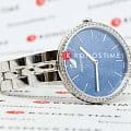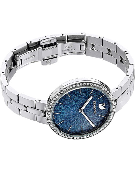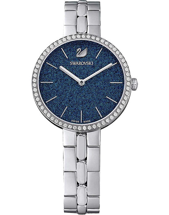 Синий циферблат с изящными серебристыми метками и стрелками подчёркивает элегантность часов. На отметке «12 часов» расположен логотип Swarovski в виде лебедя.