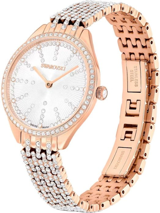 Часы Swarovski 5644053 – это воплощение изысканного дизайна и функциональности, созданное для тех, кто ценит красоту и точность. Золотистый круглый корпус и безелемБезельВнешний ободок, закрепляющий стекло. В спортивных часах так называется поворотное кольцо с делениями на циферблате, выполняет роль таймера – замеряет отрезки времени на шкале. Неподвижный безель – элемент декора. Однонаправленно вращающийся безель на дайверских часах позволяет фиксировать моменты погружения и выныривания на поверхность. из нержавеющей стали PVDPVDУльтратонкое покрытие наносится в технике вакуумного напыления, сочетает в себе нитрид титана особой прочности со слоем золота или оксида хрома. Несёт в себе декоративную или защитную функцию. покрытием, украшенным паве из тридцати мерцающих кристаллов. Под минеральным стекломМинеральное стеклоМинеральное стекло представляет собой искусственно выращенный минерал кварца. Такое стекло отличается особой устойчивостью к повреждениям и царапинам. Уступает по некоторым качествам сапфировому стеклу. открывается серебристый циферблат украшен гильошированным узором и кристаллами для индексных меток. Рифленая заводная головка украшена кристаллом круглой огранки. Стальной браслет с PVDPVDУльтратонкое покрытие наносится в технике вакуумного напыления, сочетает в себе нитрид титана особой прочности со слоем золота или оксида хрома. Несёт в себе декоративную или защитную функцию. покрытием и застежкой «бабочка»Застёжка "бабочка"Такой вид застёжки дополняется предохранителями, помогающими избежать случайного раскрытия браслета. Обладают изящным исполнением. , декорирован кристаллами Swarovski. Водозащита 50WR делает их устойчивыми к влаге, позволяя наслаждаться стильным аксессуаром в любых условиях.