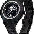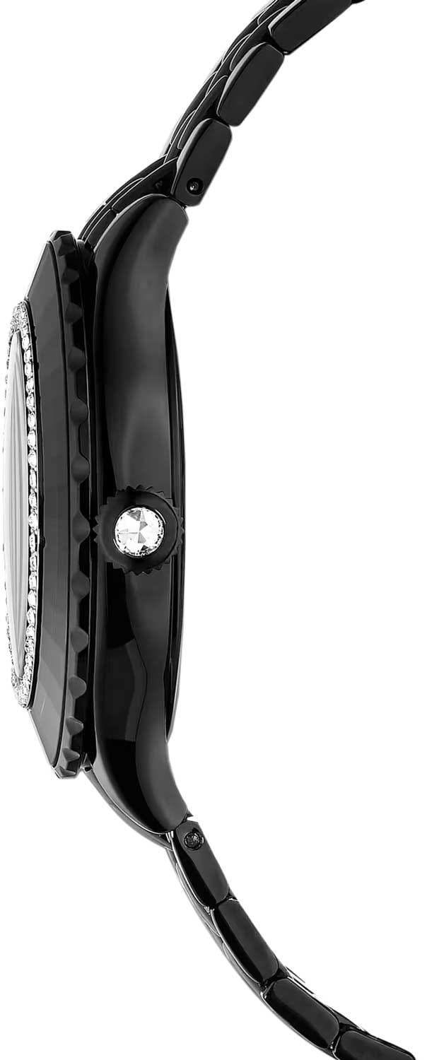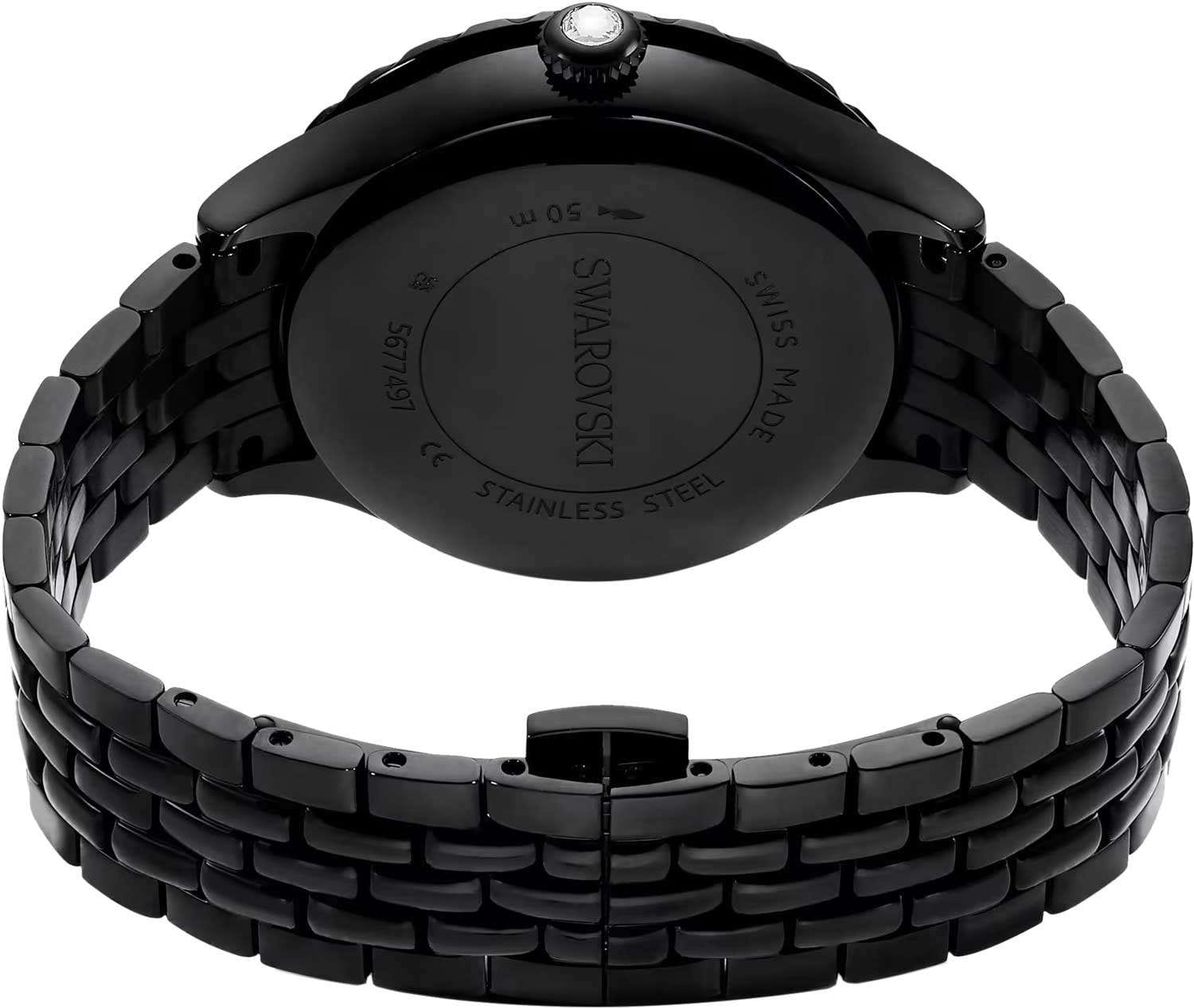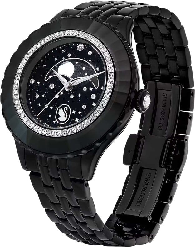 Часы Swarovski 5677497 представляют собой изысканное сочетание стиля и функциональности, что делает их идеальным выбором для ценителей элегантных аксессуаров. Эти швейцарские кварцевые часы заключены в стальной черный корпус PVDPVDУльтратонкое покрытие наносится в технике вакуумного напыления, сочетает в себе нитрид титана особой прочности со слоем золота или оксида хрома. Несёт в себе декоративную или защитную функцию. покрытием с черным циферблатом, украшенным сверкающими кристаллами Swarovski, создающими впечатление звездного неба. Особое внимание привлекает инкрустация кристаллами как на корпусе, так и на циферблате, а также черный кристальный безельБезельВнешний ободок, закрепляющий стекло. В спортивных часах так называется поворотное кольцо с делениями на циферблате, выполняет роль таймера – замеряет отрезки времени на шкале. Неподвижный безель – элемент декора. Однонаправленно вращающийся безель на дайверских часах позволяет фиксировать моменты погружения и выныривания на поверхность., что подчеркивает роскошь и утонченность изделия. Минеральное стеклоМинеральное стеклоМинеральное стекло представляет собой искусственно выращенный минерал кварца. Такое стекло отличается особой устойчивостью к повреждениям и царапинам. Уступает по некоторым качествам сапфировому стеклу. надежно защищает циферблат, а водозащита 50 WR обеспечивает защиту от воды в повседневных ситуациях. Часы оснащены функцией отображения фазы Луны, добавляющей уникальности и функциональности аксессуару. Люминесцентное покрытиеЛюминесцентное покрытиеПозволяет считывать показания времени в темноте. Производители наносят на стрелки, часовые индексы, безель или поверхность циферблата светонакопительный состав, дающий холодное свечение. на стрелках обеспечивает отличную видимость в темноте. Черный браслет с PVDPVDУльтратонкое покрытие наносится в технике вакуумного напыления, сочетает в себе нитрид титана особой прочности со слоем золота или оксида хрома. Несёт в себе декоративную или защитную функцию. покрытием и застежкой «бабочка»Застёжка "бабочка"Такой вид застёжки дополняется предохранителями, помогающими избежать случайного раскрытия браслета. Обладают изящным исполнением. обеспечивает комфортное ношение и стильный внешний вид. Заводная головка украшена кристаллом круглой огранки, придающим часам завершенность и изящество. Эти часы не просто аксессуар, а настоящее произведение искусства, способное стать ярким акцентом любого образа.