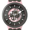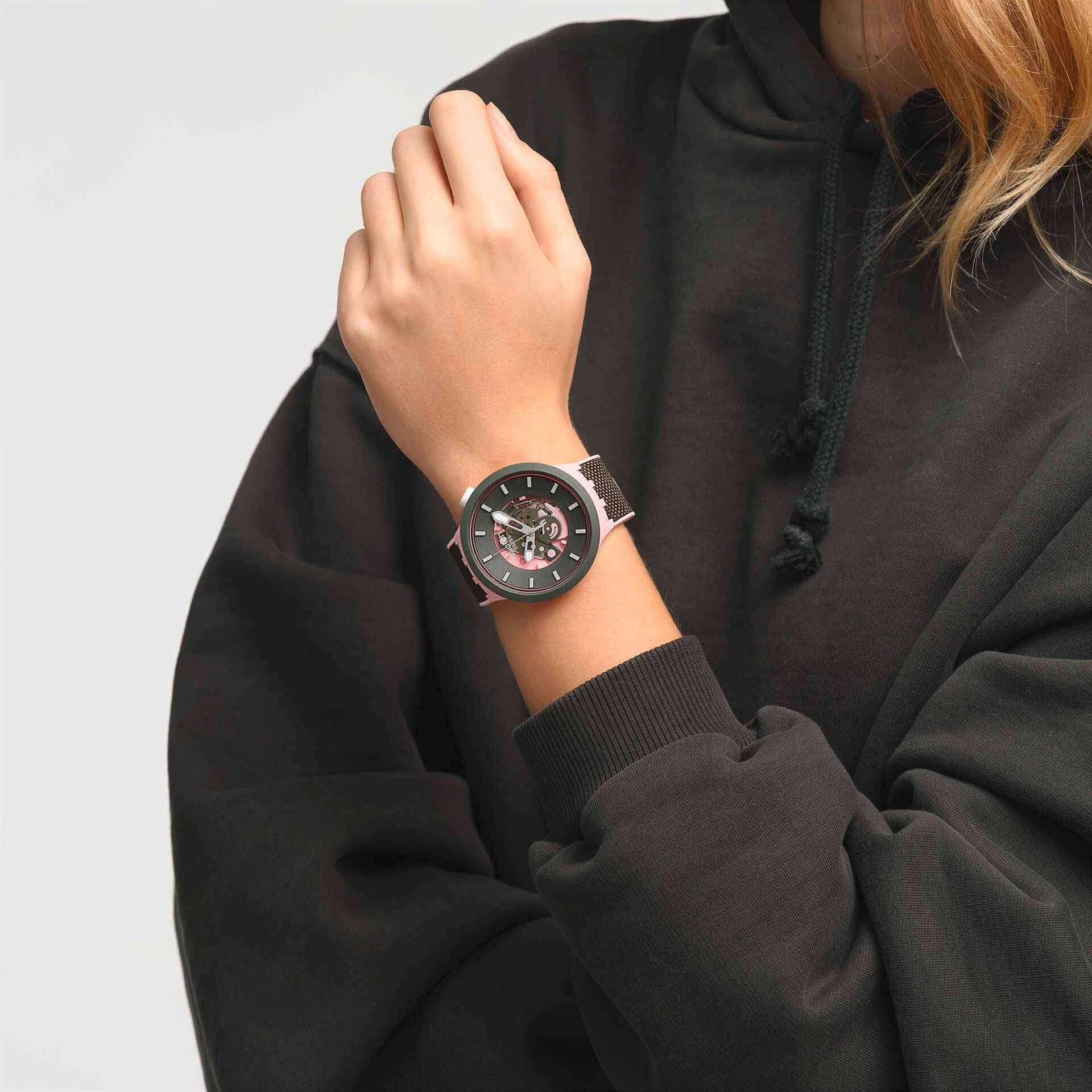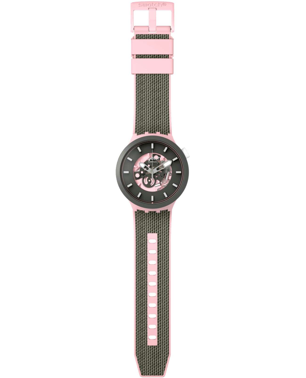 Часы Swatch SB05P100 — это стильный и современный аксессуар для тех, кто ценит лёгкость и комфорт. Часы идеально подойдут как для мужчин, так и для женщин. Эти большие часы пастельно-розового цвета с темно-серым циферблатом с вырезами и светящимся в темноте светло-серым принтом, благодаря люминесцентному покрытиюЛюминесцентное покрытиеПозволяет считывать показания времени в темноте. Производители наносят на стрелки, часовые индексы, безель или поверхность циферблата светонакопительный состав, дающий холодное свечение.. Корпус и безельБезельВнешний ободок, закрепляющий стекло. В спортивных часах так называется поворотное кольцо с делениями на циферблате, выполняет роль таймера – замеряет отрезки времени на шкале. Неподвижный безель – элемент декора. Однонаправленно вращающийся безель на дайверских часах позволяет фиксировать моменты погружения и выныривания на поверхность. сделаны из биоматериала. Силиконовый ремешок, отделанный темно-серым текстилем, выполнен в однотонном матово-розовом цвете. Стекло и корпус этих часов с большим циферблатом изготовлены из биоматериала. Водозащита 30 метров делает часы практичными для повседневного использования. Эти часы подойдут для повседневного ношения и станут ярким акцентом в вашем наряде.