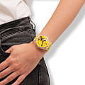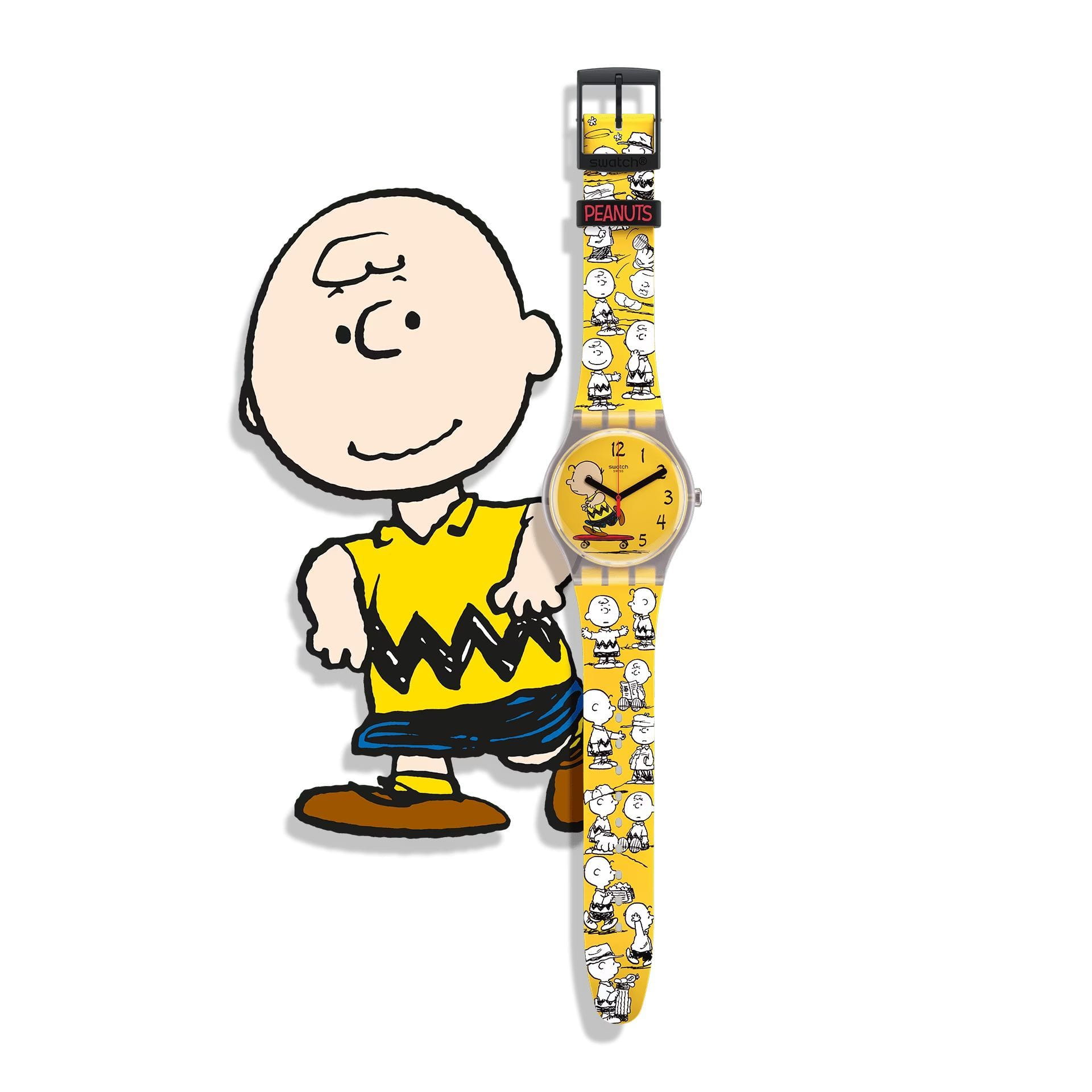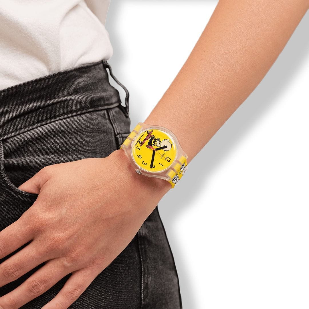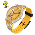 Часы Swatch SO29Z101 —  стильный и надежный аксессуар. Эти позитивные часы имеют прозрачный корпус из биоматериала, желтый силиконовый ремешок, черные стрелки и индексы, принт на всей поверхности Swatch X Peanuts. Циферблат покрыт биостеклом. Мерцающий блеск модели обусловлен особым методом гравированной отделки. Ремешок на классической застежке. Внутри часов установлен надежный кварцевый механизм, который обеспечивает точность хода. Эти часы водонепроницаемы до 30 метров, что позволяет не беспокоиться о случайных брызгах или дождевых каплях. Swatch SO29Z101 — это идеальный выбор для тех, кто ценит сочетание стиля, комфорта и функциональности в одном аксессуаре.