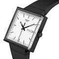 Swatch New Square Bioceramic Standard SO34B700 "WHAT IF...BLACK?" - это стильные квадратные часы с корпусом 33x33 мм из черной матовой биокерамики и белым циферблатом. Модель оснащена кварцевым механизмом, окошком даты и дня недели, водонепроницаемостью до 20 метров. Стрелки с люминесцентным покрытиемЛюминесцентное покрытиеПозволяет считывать показания времени в темноте. Производители наносят на стрелки, часовые индексы, безель или поверхность циферблата светонакопительный состав, дающий холодное свечение.. Часы имеют черный матовый ремешок из биоматериала и стекло из биоматериала. Эта экологичная модель унисекс сочетает инновационные материалы с классическим черно-белым дизайном, вдохновленным оригинальным Swatch 1983 года, и подходит для тех, кто ценит минимализм и заботу об окружающей среде.