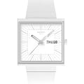 Swatch Square Bioceramic Standard SO34W700 "WHAT IF...ALLWHITE?" - это стильные квадратные часы с корпусом 41,8*41,8 мм из матовой биокерамики белого цвета. Модель оснащена кварцевым механизмом, окошком даты и дня недели, водонепроницаемостью до 20 метров. Часы имеют белый матовый ремешок из биоматериала, белый циферблат и стекло из биоматериала. Стрелки с люминесцентным покрытиемЛюминесцентное покрытиеПозволяет считывать показания времени в темноте. Производители наносят на стрелки, часовые индексы, безель или поверхность циферблата светонакопительный состав, дающий холодное свечение.. Эта экологичная модель унисекс сочетает инновационные материалы с необычным полностью белым дизайном с серебристыми индексами и стрелками, вдохновленным оригинальным Swatch 1983 года, и подходит для тех, кто ценит минимализм и заботу об окружающей среде.