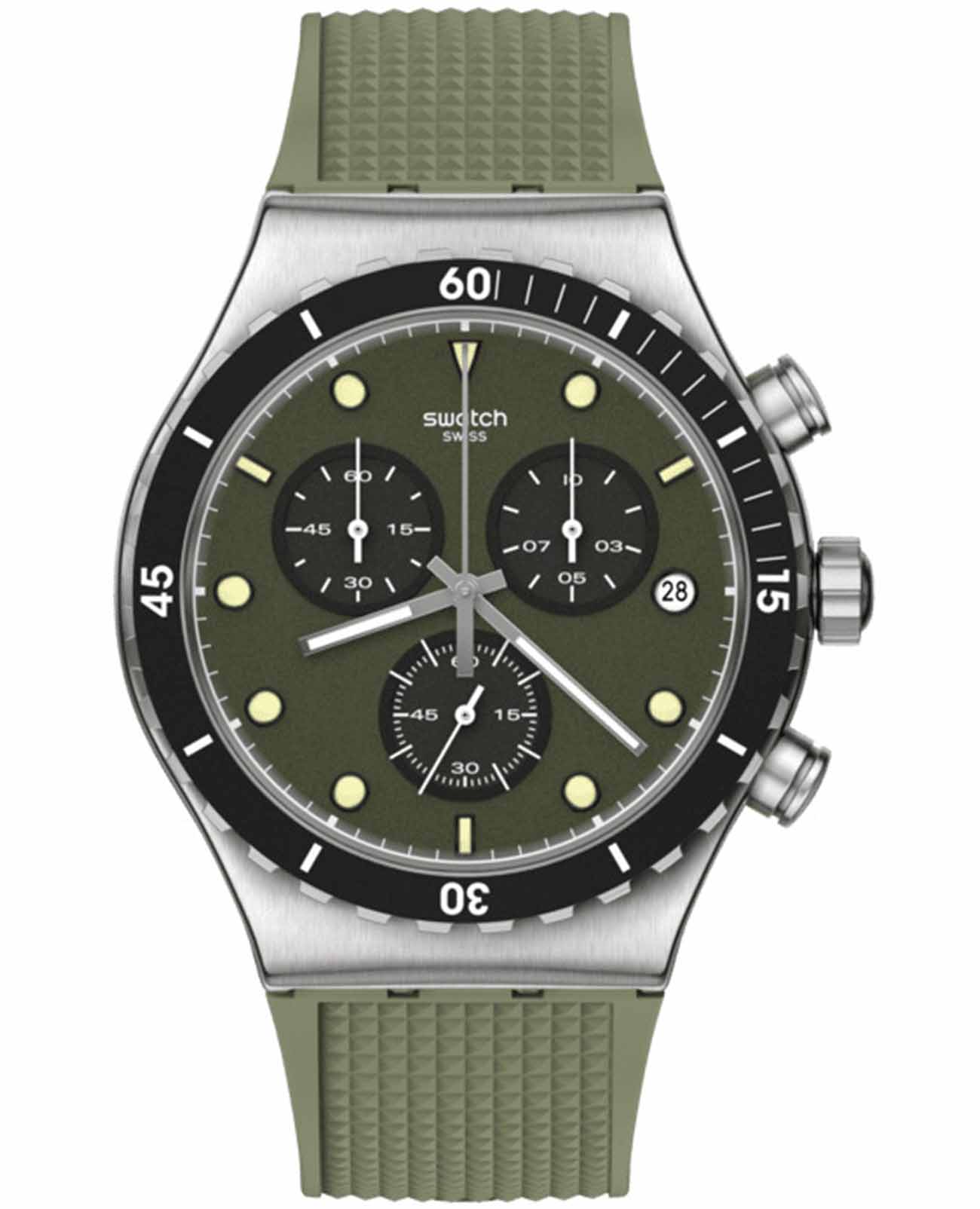 Часы Swatch YVS488 — это стильный и современный аксессуар для тех, кто ценит лёгкость и комфорт. Эта стильная модель часов из нержавеющей стали дополнена зеленым каучуковым ремешком с фактурным верхом и матовой застежкой из нержавеющей стали. Но изюминка этих часов — матовый зеленый циферблат с черными счетчиками хронографаХронографФункция позволяет измерять отрезки времени с особой точностью: часы, минуты, секунды. Верным признаком хронографа является наличие на циферблате 3 дополнительных окошек-счётчиков., индексами и стрелками с люминесцентным покрытиемЛюминесцентное покрытиеПозволяет считывать показания времени в темноте. Производители наносят на стрелки, часовые индексы, безель или поверхность циферблата светонакопительный состав, дающий холодное свечение.. Завершают образ индикатор даты в положении «3 часа» на циферблате, а также серебристые цифры и индексы на безелеБезельВнешний ободок, закрепляющий стекло. В спортивных часах так называется поворотное кольцо с делениями на циферблате, выполняет роль таймера – замеряет отрезки времени на шкале. Неподвижный безель – элемент декора. Однонаправленно вращающийся безель на дайверских часах позволяет фиксировать моменты погружения и выныривания на поверхность. из нержавеющей стали с черным PVDPVDУльтратонкое покрытие наносится в технике вакуумного напыления, сочетает в себе нитрид титана особой прочности со слоем золота или оксида хрома. Несёт в себе декоративную или защитную функцию. покрытием. Водозащита 30 метров делает часы практичными для повседневного использования. Эти часы подойдут для повседневного ношения и станут ярким акцентом в вашем наряде.