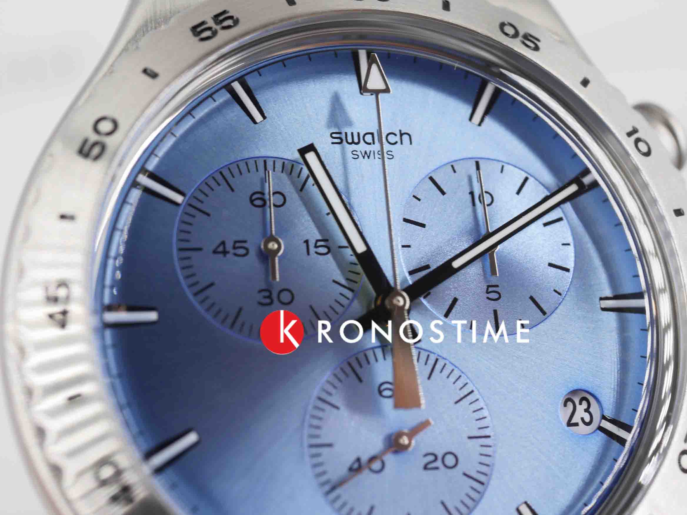 Часы Swatch YVS528G — это стильный и современный аксессуар для тех, кто ценит лёгкость и комфорт. Эта стильная модель часов из нержавеющей стали дополнена матовым металлическим браслетом из нержавеющей стали со съемными звеньями и застёжкой «бабочка»Застёжка "бабочка"Такой вид застёжки дополняется предохранителями, помогающими избежать случайного раскрытия браслета. Обладают изящным исполнением. . Голубой циферблат с радиальной полировкой оснащен хронографомХронографФункция позволяет измерять отрезки времени с особой точностью: часы, минуты, секунды. Верным признаком хронографа является наличие на циферблате 3 дополнительных окошек-счётчиков. и светящимися в темноте индексами и стрелками из-за люминесцентного покрытияЛюминесцентное покрытиеПозволяет считывать показания времени в темноте. Производители наносят на стрелки, часовые индексы, безель или поверхность циферблата светонакопительный состав, дающий холодное свечение. заключен в матовый корпус из нержавеющей стали. Завершают образ индикатор даты в положении «4 часа» на циферблате, а также черные цифры и индексы на безелеБезельВнешний ободок, закрепляющий стекло. В спортивных часах так называется поворотное кольцо с делениями на циферблате, выполняет роль таймера – замеряет отрезки времени на шкале. Неподвижный безель – элемент декора. Однонаправленно вращающийся безель на дайверских часах позволяет фиксировать моменты погружения и выныривания на поверхность. из нержавеющей стали. Водозащита 30 метров делает часы практичными для повседневного использования. Эти часы подойдут для повседневного ношения и станут ярким акцентом в вашем наряде.
