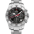 Мужские швейцарские кварцевые часы-хронографХронографФункция позволяет измерять отрезки времени с особой точностью: часы, минуты, секунды. Верным признаком хронографа является наличие на циферблате 3 дополнительных окошек-счётчиков. Swiss Military by Chrono SMS34072.01, кварцевый механизм с высокой точностью. Минеральное стекло устойчивое к появлению царапин, обладающее высокой прозрачностью. Класс водозащиты: 100 метров, позволит плавать, нырять и заниматься другими водными видами спорта. Корпус часов изготовлен из нержавеющей стали серебристого цвета. Апертура даты расположена между отметками 4 и 5 часов. Стрелки и метки с люминесцентной подсветкойЛюминесцентное покрытиеПозволяет считывать показания времени в темноте. Производители наносят на стрелки, часовые индексы, безель или поверхность циферблата светонакопительный состав, дающий холодное свечение.. Заводная головка с защитой. Браслет с раскладной застёжкойРаскладная застёжкаТакой тип застёжки используется только на браслетах из металла. Она никогда не раскрывается полностью, происходит разделение на 2 и более частей. Раскладывающая застёжка снизит вероятность потери часов к минимуму..