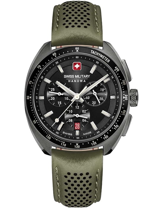 Мужские швейцарские часы-хронографХронографФункция позволяет измерять отрезки времени с особой точностью: часы, минуты, секунды. Верным признаком хронографа является наличие на циферблате 3 дополнительных окошек-счётчиков. Swiss Military Hanowa SMWGC0003340, кварцевый механизм с высокой точностью. Сапфировое стеклоСапфировое стеклоПрочный и надёжный материал из кристалла сапфира синтетического происхождения, характеризующийся особой твёрдостью и устойчивостью к царапинам и повреждениям. устойчивое к появлению царапин, обладающее высокой прозрачностью. Класс водозащиты: 100 метров, позволит плавать, нырять и заниматься другими водными видами спорта. Корпус часов изготовлен из стали с IP-покрытиемIP-покрытиеМетод ионного напыления. Демонстрирует повышенную устойчивость к истиранию, окислению и химическим веществам. Под воздействием высокого давления и температуры около 1500°C молекулы металла надёжно соединяются с частицами корпуса часов.. Кожаный ремешок. БезельБезельВнешний ободок, закрепляющий стекло. В спортивных часах так называется поворотное кольцо с делениями на циферблате, выполняет роль таймера – замеряет отрезки времени на шкале. Неподвижный безель – элемент декора. Однонаправленно вращающийся безель на дайверских часах позволяет фиксировать моменты погружения и выныривания на поверхность. с тахиметромТахиметрРазмеченная шкала, располагается на ободке или безеле часов. Тахиметр позволяет рассчитать скорость на определённом участке пути, расстояние измеряется в километрах или милях. изготовлен из нержавеющей стали с IP-покрытиемIP-покрытиеМетод ионного напыления. Демонстрирует повышенную устойчивость к истиранию, окислению и химическим веществам. Под воздействием высокого давления и температуры около 1500°C молекулы металла надёжно соединяются с частицами корпуса часов..