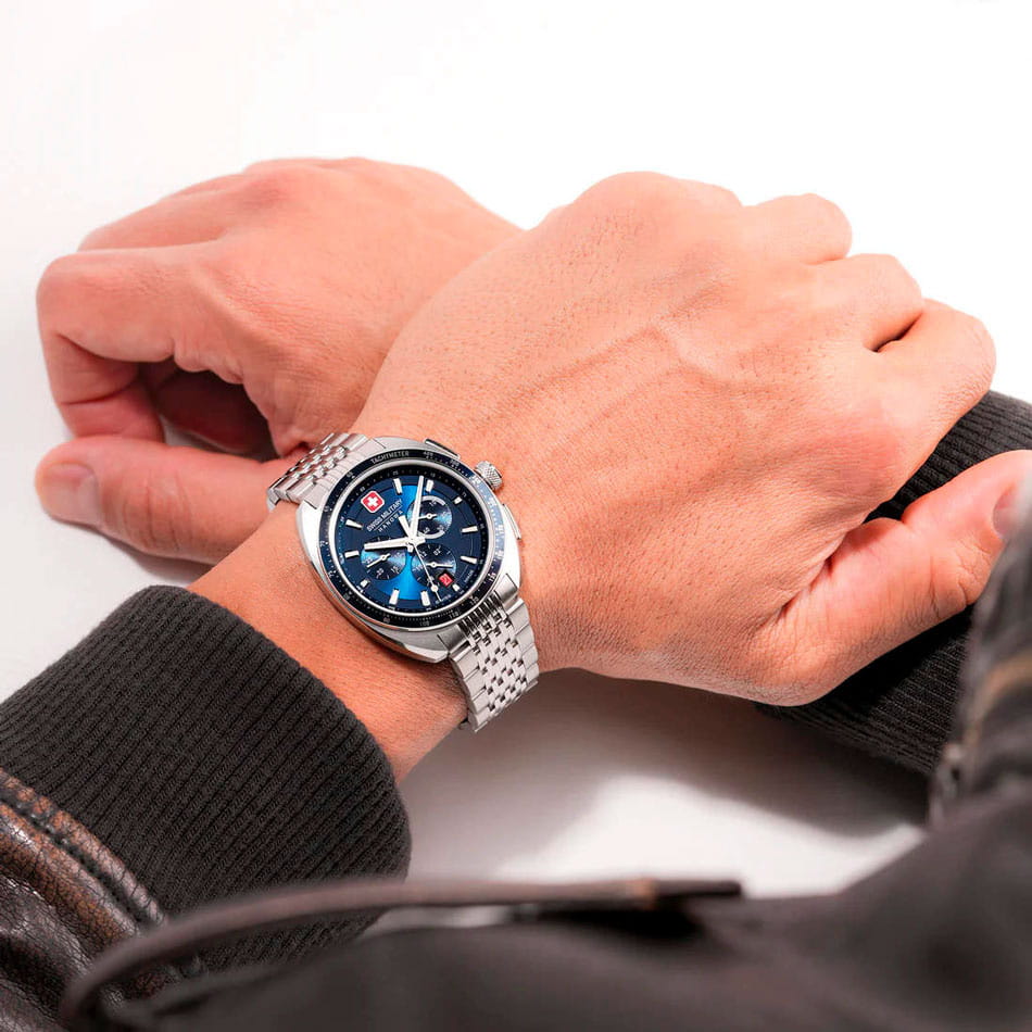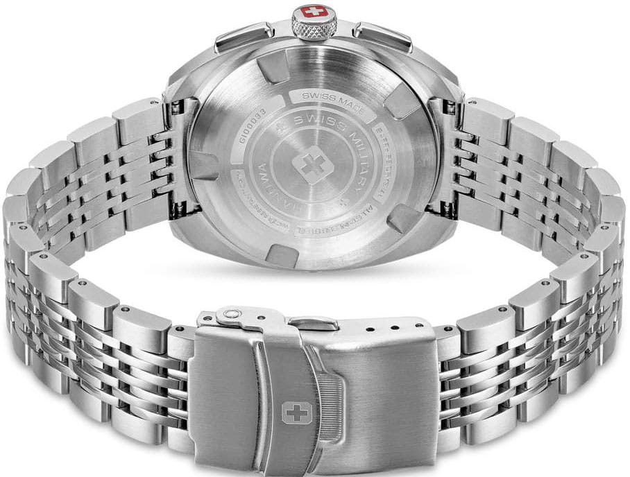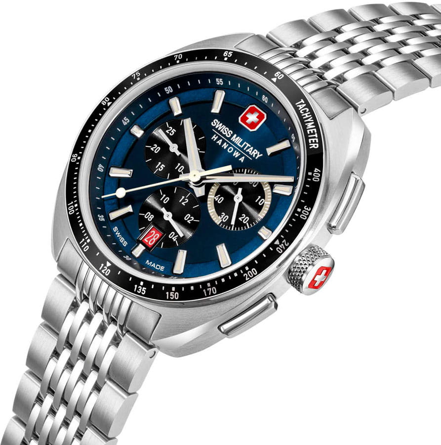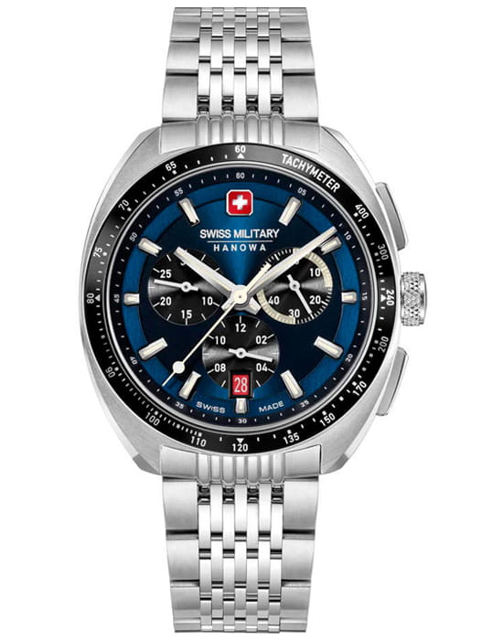 Мужские швейцарские часы-хронографХронографФункция позволяет измерять отрезки времени с особой точностью: часы, минуты, секунды. Верным признаком хронографа является наличие на циферблате 3 дополнительных окошек-счётчиков. Swiss Military Hanowa SMWGI0003303, кварцевый механизм с высокой точностью. Сапфировое стеклоСапфировое стеклоПрочный и надёжный материал из кристалла сапфира синтетического происхождения, характеризующийся особой твёрдостью и устойчивостью к царапинам и повреждениям. устойчивое к появлению царапин, обладающее высокой прозрачностью. Класс водозащиты: 100 метров, позволит плавать, нырять и заниматься другими водными видами спорта. Корпус часов изготовлен из стали. Стальной браслет на раскладной застёжкеРаскладная застёжкаТакой тип застёжки используется только на браслетах из металла. Она никогда не раскрывается полностью, происходит разделение на 2 и более частей. Раскладывающая застёжка снизит вероятность потери часов к минимуму.. БезельБезельВнешний ободок, закрепляющий стекло. В спортивных часах так называется поворотное кольцо с делениями на циферблате, выполняет роль таймера – замеряет отрезки времени на шкале. Неподвижный безель – элемент декора. Однонаправленно вращающийся безель на дайверских часах позволяет фиксировать моменты погружения и выныривания на поверхность. с тахиметромТахиметрРазмеченная шкала, располагается на ободке или безеле часов. Тахиметр позволяет рассчитать скорость на определённом участке пути, расстояние измеряется в километрах или милях. изготовлен из нержавеющей стали с IP-покрытиемIP-покрытиеМетод ионного напыления. Демонстрирует повышенную устойчивость к истиранию, окислению и химическим веществам. Под воздействием высокого давления и температуры около 1500°C молекулы металла надёжно соединяются с частицами корпуса часов..