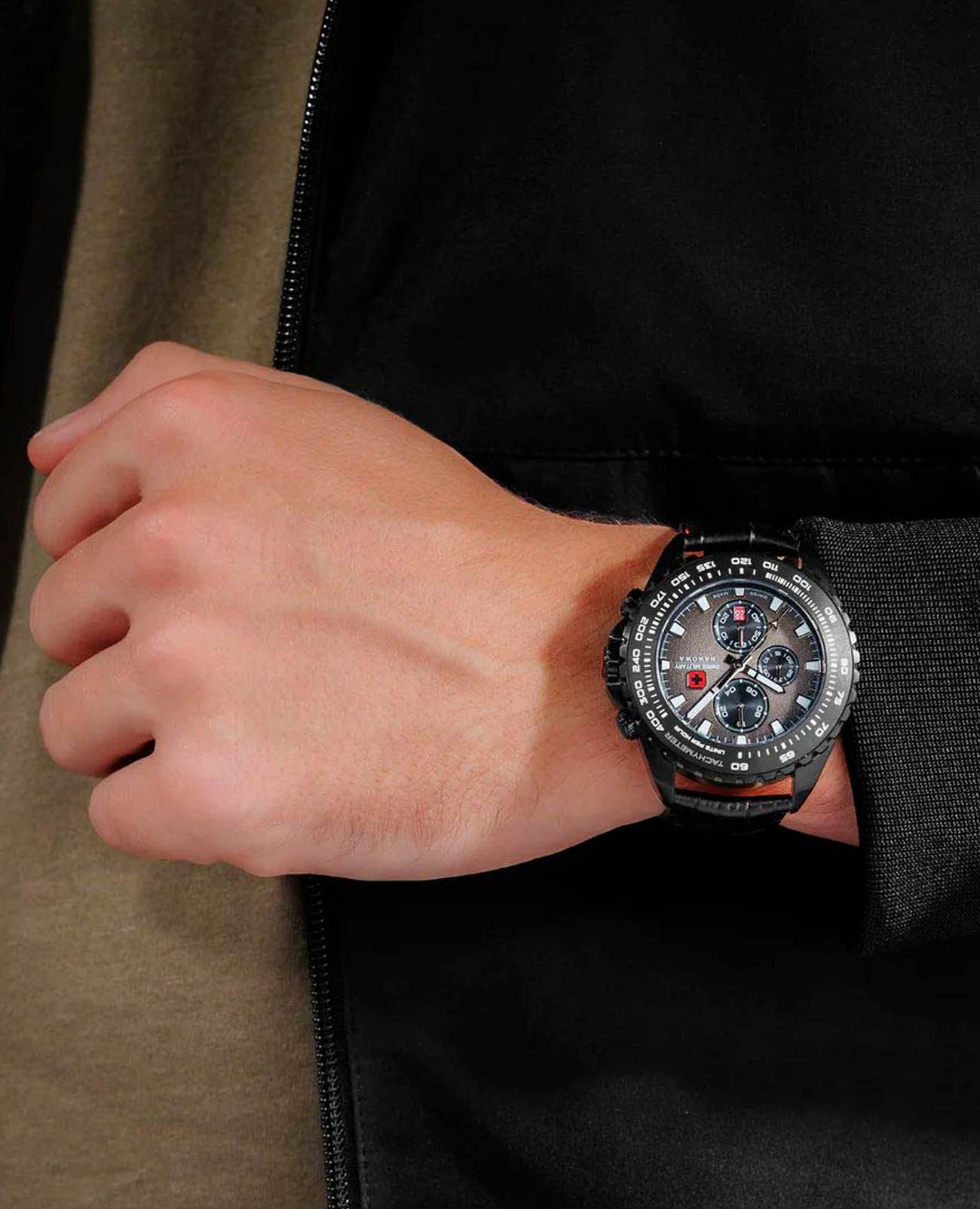 Мужские швейцарские часы- хронографХронографФункция позволяет измерять отрезки времени с особой точностью: часы, минуты, секунды. Верным признаком хронографа является наличие на циферблате 3 дополнительных окошек-счётчиков. с секундомеромСекундомерСекундоме́р — прибор, способный измерять интервалы времени с точностью до долей секунды. Swiss Military Hanowa Stone Marten SMWGC0001832, кварцевый механизм с высокой точностью. Сапфировое стеклоСапфировое стеклоПрочный и надёжный материал из кристалла сапфира синтетического происхождения, характеризующийся особой твёрдостью и устойчивостью к царапинам и повреждениям. устойчивое к появлению царапин, обладающее высокой прозрачностью. Корпус часов изготовлен из нержавеющей стали с IP-покрытиемIP-покрытиеМетод ионного напыления. Демонстрирует повышенную устойчивость к истиранию, окислению и химическим веществам. Под воздействием высокого давления и температуры около 1500°C молекулы металла надёжно соединяются с частицами корпуса часов.. Неподвижный безельБезельВнешний ободок, закрепляющий стекло. В спортивных часах так называется поворотное кольцо с делениями на циферблате, выполняет роль таймера – замеряет отрезки времени на шкале. Неподвижный безель – элемент декора. Однонаправленно вращающийся безель на дайверских часах позволяет фиксировать моменты погружения и выныривания на поверхность. из стали с IP-покрытиемIP-покрытиеМетод ионного напыления. Демонстрирует повышенную устойчивость к истиранию, окислению и химическим веществам. Под воздействием высокого давления и температуры около 1500°C молекулы металла надёжно соединяются с частицами корпуса часов. и шкалой тахиметрТахиметрРазмеченная шкала, располагается на ободке или безеле часов. Тахиметр позволяет рассчитать скорость на определённом участке пути, расстояние измеряется в километрах или милях.. Стрелки и метки с люминесцентным покрытиемЛюминесцентное покрытиеПозволяет считывать показания времени в темноте. Производители наносят на стрелки, часовые индексы, безель или поверхность циферблата светонакопительный состав, дающий холодное свечение.. Класс водозащиты: 100 метров, позволит плавать, нырять и заниматься другими водными видами спорта. Кожаный ремешок на стандартной застежке.