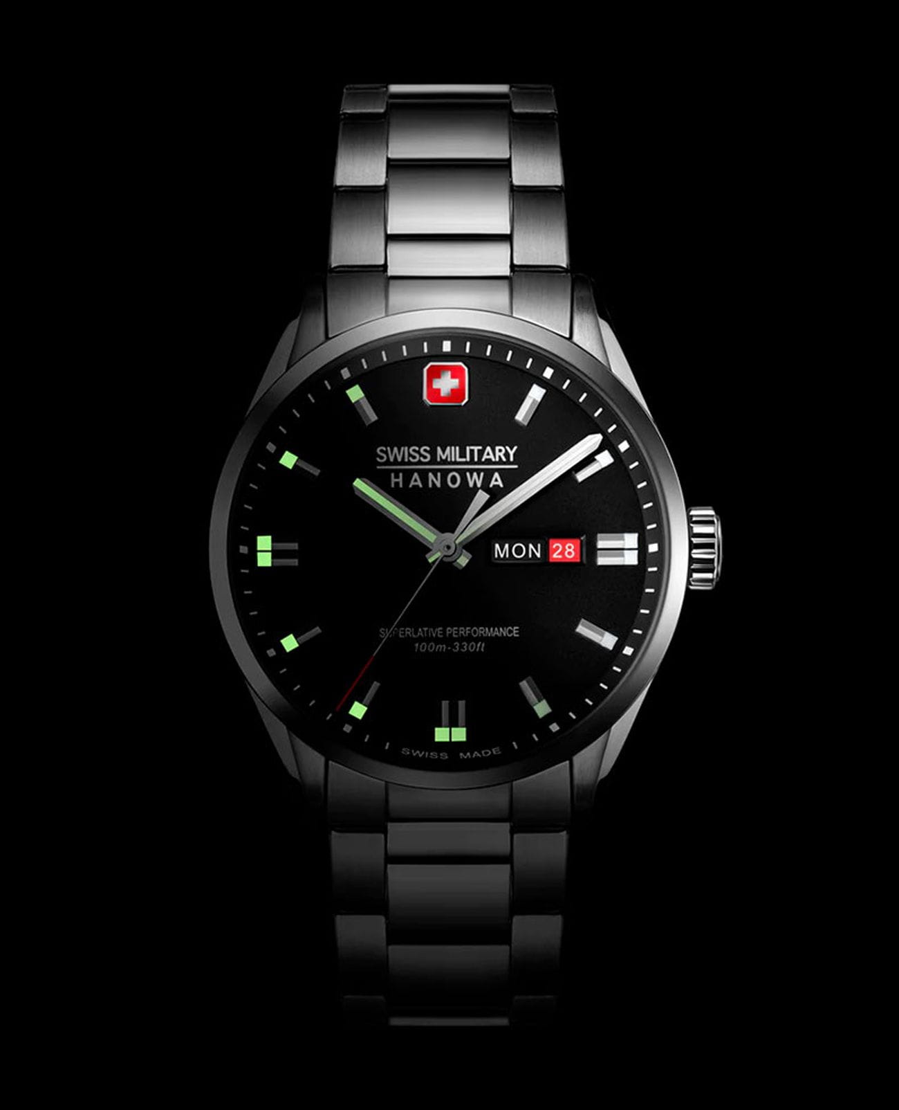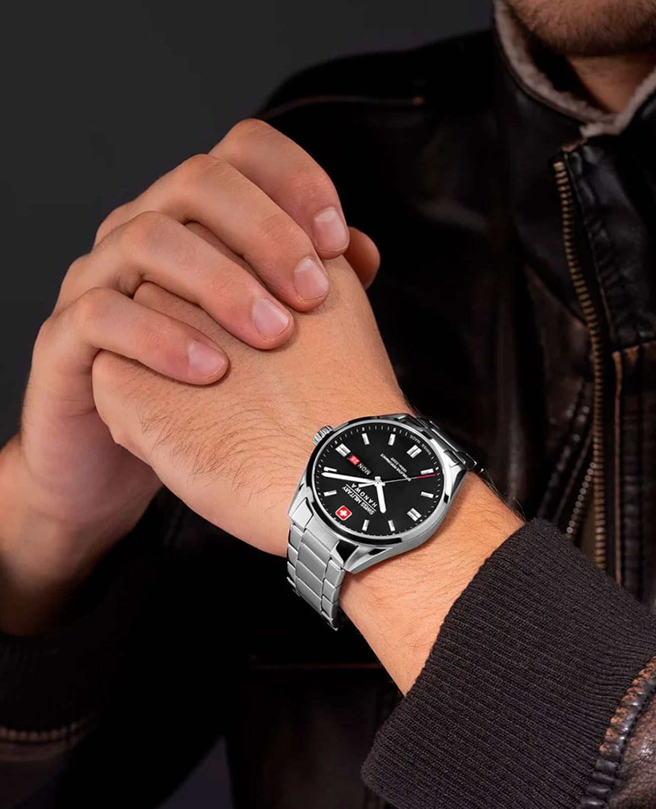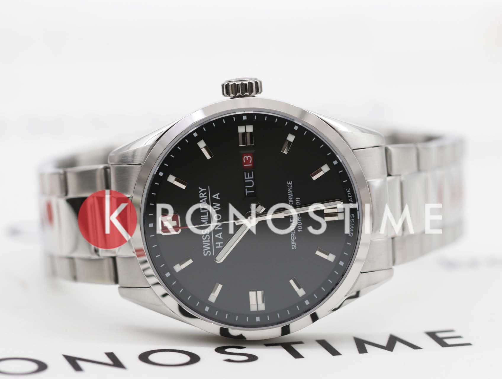Мужские швейцарские часы с сапфировым стекломСапфировое стеклоПрочный и надёжный материал из кристалла сапфира синтетического происхождения, характеризующийся особой твёрдостью и устойчивостью к царапинам и повреждениям. Swiss Military Hanowa Maxed SMWGH0001601, кварцевый механизм с высокой точностью. Сапфировое стеклоСапфировое стеклоПрочный и надёжный материал из кристалла сапфира синтетического происхождения, характеризующийся особой твёрдостью и устойчивостью к царапинам и повреждениям. устойчивое к появлению царапин, обладающее высокой прозрачностью. Корпус часов изготовлен из стали. Окошко даты находится в положении 3 часов. Стрелки и метки с люминесцентным покрытиемЛюминесцентное покрытиеПозволяет считывать показания времени в темноте. Производители наносят на стрелки, часовые индексы, безель или поверхность циферблата светонакопительный состав, дающий холодное свечение.. Класс водозащиты: 100 метров, позволит плавать, нырять и заниматься другими водными видами спорта. Стальной браслет на раскладной застёжкеРаскладная застёжкаТакой тип застёжки используется только на браслетах из металла. Она никогда не раскрывается полностью, происходит разделение на 2 и более частей. Раскладывающая застёжка снизит вероятность потери часов к минимуму..