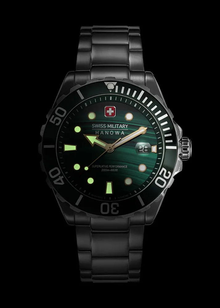 Swiss Military Hanowa Greyhound SMWGH0005804 — воплощение швейцарского качества и элегантного дизайна. Лимитированная серия — 444 экземпляра. Эти часы идеально подойдут для уверенного в себе мужчины, ценящего стиль и надежность. Корпус часов выполнен из нержавеющей стали, что придает им современный и мужественный вид. Диаметр корпуса составляет 44 мм, что делает их универсальным аксессуаром для любого случая. Циферблат из натурального малахита, метки и стрелки светятся в темноте благодаря люминесцентному покрытиюЛюминесцентное покрытиеПозволяет считывать показания времени в темноте. Производители наносят на стрелки, часовые индексы, безель или поверхность циферблата светонакопительный состав, дающий холодное свечение. обеспечивает отличную читаемость и подчеркивает строгий стиль модели. Сапфировое стеклоСапфировое стеклоПрочный и надёжный материал из кристалла сапфира синтетического происхождения, характеризующийся особой твёрдостью и устойчивостью к царапинам и повреждениям. защищает циферблат от царапин и повреждений, гарантируя долгий срок службы и сохранение первоначального внешнего вида часов. Часы оснащены надежным кварцевым механизмом, который обеспечивает высокую точность хода. Водозащита на уровне 200WR позволит плавать, нырять и заниматься другими водными видами спорта. Вращающийся в одном направлении рифленый безельБезельВнешний ободок, закрепляющий стекло. В спортивных часах так называется поворотное кольцо с делениями на циферблате, выполняет роль таймера – замеряет отрезки времени на шкале. Неподвижный безель – элемент декора. Однонаправленно вращающийся безель на дайверских часах позволяет фиксировать моменты погружения и выныривания на поверхность. с IP-покрытиемIP-покрытиеМетод ионного напыления. Демонстрирует повышенную устойчивость к истиранию, окислению и химическим веществам. Под воздействием высокого давления и температуры около 1500°C молекулы металла надёжно соединяются с частицами корпуса часов.. Стальной браслет на раскладной застёжкеРаскладная застёжкаТакой тип застёжки используется только на браслетах из металла. Она никогда не раскрывается полностью, происходит разделение на 2 и более частей. Раскладывающая застёжка снизит вероятность потери часов к минимуму. обеспечивает комфортное ношение на запястье.
