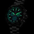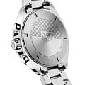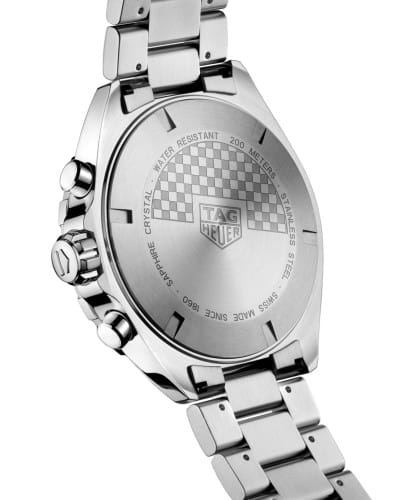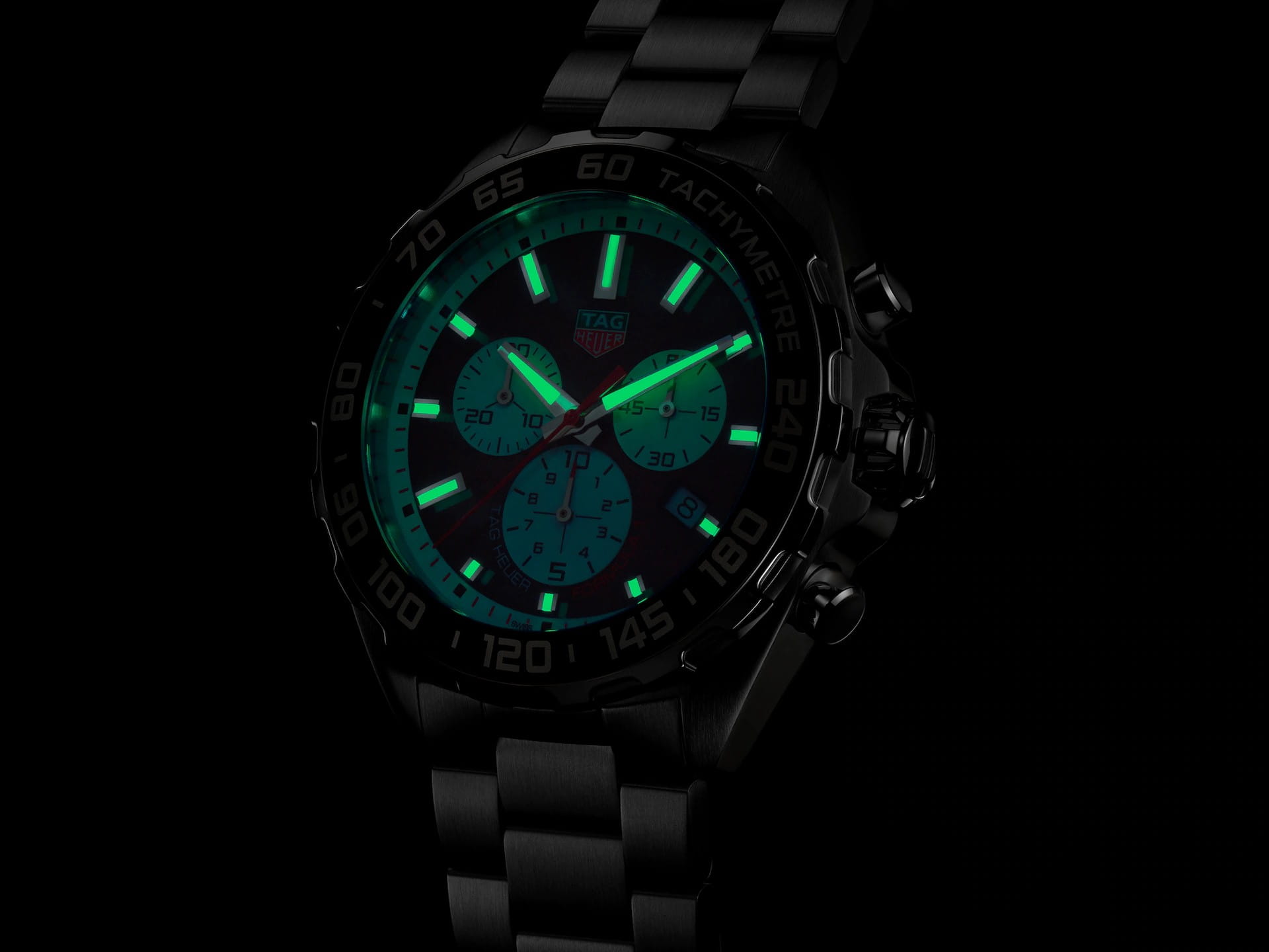 Выполненный в гоночной тематике хронограф с кварцевым механизмом, черным опаловым циферблатом, белым фланцем и белыми опаловыми вспомогательными циферблатами в положениях «3 часа»,«6 часов» и «9 часов». Стрелки вспомогательного циферблата огненно-красного цвета с эффектным покрытием из черного золота. Серебристые часовые индексы, часовые и минутные стрелки с белым люминесцентным покрытием Super-LumiNova® для превосходной читаемости показаний при слабом освещении.