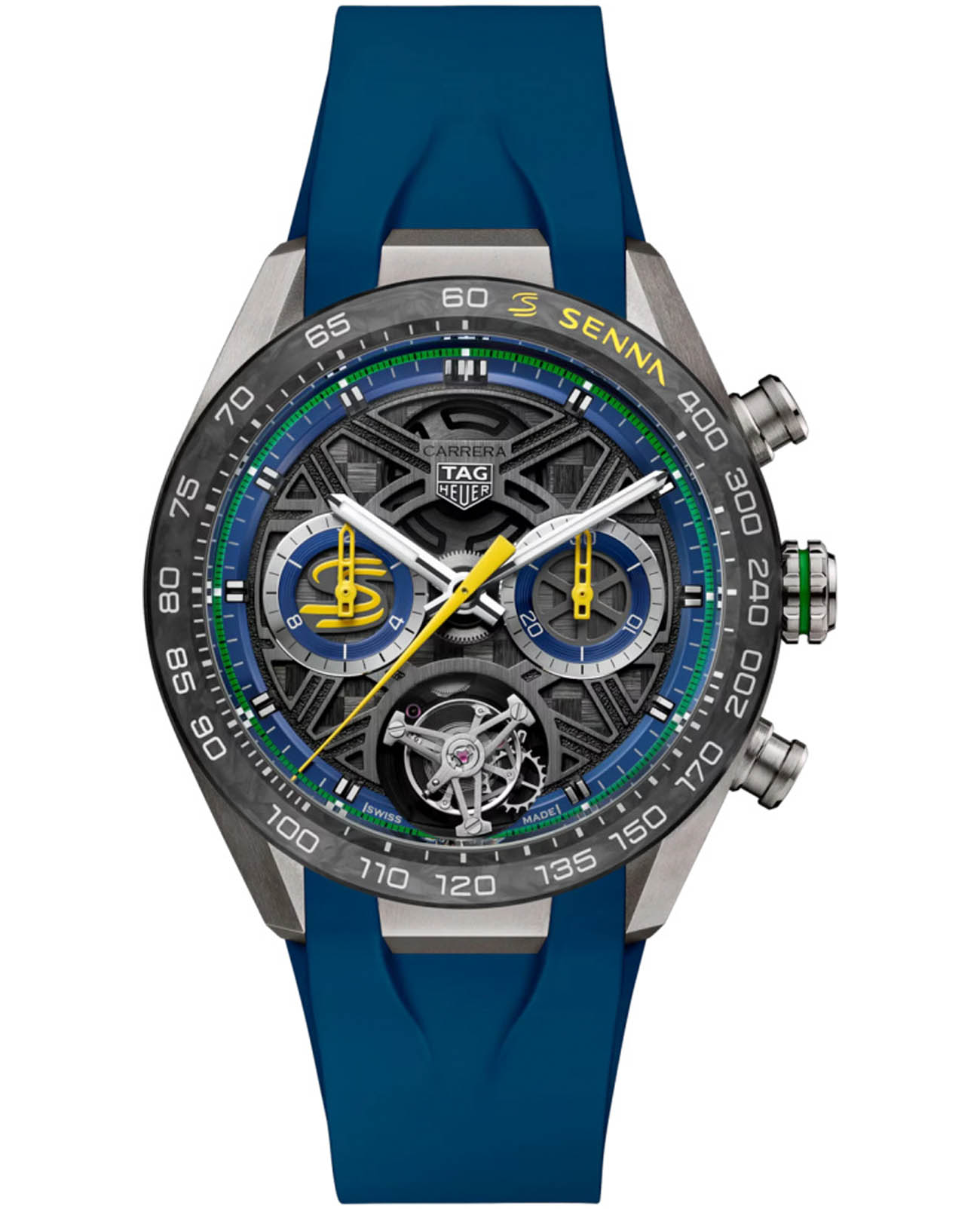 Часы TAG Heuer Carrera Chronograph Tourbillon Extreme Sport x Senna CBU5081.FT6274. Эта потрясающая версия поднимает классическую модель Carrera на новые высоты. Эти часы современный шедевр, выпущенные ограниченной серией. Часы оснащены мануфактурным механизмом TAG Heuer TH20-09. Изысканный скелетон, скелетонизированный циферблат с кольцами и стрелками, открывает вид на сложную механику часов. Высокая функциональность в нем сочетается с изысканной элегантностью, в то время как сапфировое стеклоСапфировое стеклоПрочный и надёжный материал из кристалла сапфира синтетического происхождения, характеризующийся особой твёрдостью и устойчивостью к царапинам и повреждениям. обеспечивает сверхточную разборчивость.Часы-хронографХронографФункция позволяет измерять отрезки времени с особой точностью: часы, минуты, секунды. Верным признаком хронографа является наличие на циферблате 3 дополнительных окошек-счётчиков.. Механический механизм (автоматический калибр) с высокой точностью. Класс водозащиты: 100 метров, позволит плавать, нырять и заниматься другими водными видами спорта. Стрелки с люминесцентным покрытиемЛюминесцентное покрытиеПозволяет считывать показания времени в темноте. Производители наносят на стрелки, часовые индексы, безель или поверхность циферблата светонакопительный состав, дающий холодное свечение.. Корпус и неповоротный безельБезельВнешний ободок, закрепляющий стекло. В спортивных часах так называется поворотное кольцо с делениями на циферблате, выполняет роль таймера – замеряет отрезки времени на шкале. Неподвижный безель – элемент декора. Однонаправленно вращающийся безель на дайверских часах позволяет фиксировать моменты погружения и выныривания на поверхность. с PVDPVDУльтратонкое покрытие наносится в технике вакуумного напыления, сочетает в себе нитрид титана особой прочности со слоем золота или оксида хрома. Несёт в себе декоративную или защитную функцию. покрытием изготовлены из титана. Каучуковый ремешок с раскладной застёжкойРаскладная застёжкаТакой тип застёжки используется только на браслетах из металла. Она никогда не раскрывается полностью, происходит разделение на 2 и более частей. Раскладывающая застёжка снизит вероятность потери часов к минимуму..