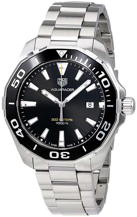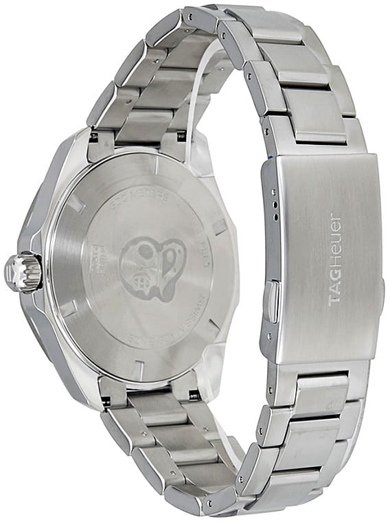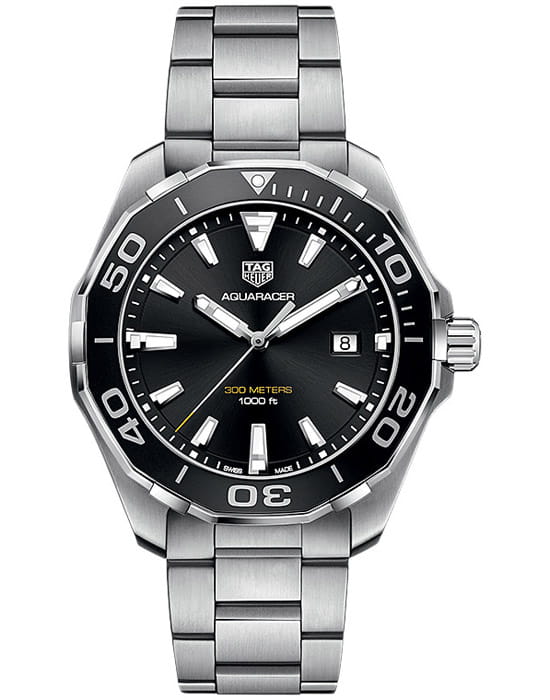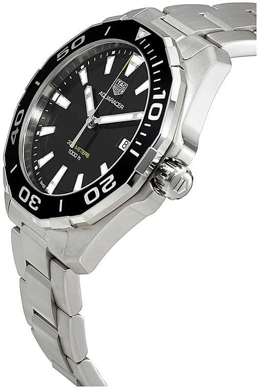 TAG Heuer Aquaracer WAY101A.BA0746 — элегантные мужские часы, сочетающие в себе стиль и функциональность. Корпус диаметром 43 мм выполнен из нержавеющей стали, а безельБезельВнешний ободок, закрепляющий стекло. В спортивных часах так называется поворотное кольцо с делениями на циферблате, выполняет роль таймера – замеряет отрезки времени на шкале. Неподвижный безель – элемент декора. Однонаправленно вращающийся безель на дайверских часах позволяет фиксировать моменты погружения и выныривания на поверхность. также изготовлен из стали и добавлением алюминия с PVD-покрытиемPVDУльтратонкое покрытие наносится в технике вакуумного напыления, сочетает в себе нитрид титана особой прочности со слоем золота или оксида хрома. Несёт в себе декоративную или защитную функцию., что придаёт модели дополнительную прочность и долговечность. Чёрный циферблат с солнечным узором оснащён накладными часовыми метками и стрелками с люминесцентным покрытиемЛюминесцентное покрытиеПозволяет считывать показания времени в темноте. Производители наносят на стрелки, часовые индексы, безель или поверхность циферблата светонакопительный состав, дающий холодное свечение., обеспечивающим отличную читаемость в любых условиях освещения. Часы оснащены точным кварцевым механизмом, гарантирующим надёжное отображение времени. Функциональность включает индикацию часов, минут, секунд и даты. Сапфировое стеклоСапфировое стеклоПрочный и надёжный материал из кристалла сапфира синтетического происхождения, характеризующийся особой твёрдостью и устойчивостью к царапинам и повреждениям. с антибликовым покрытиемАнтибликовое покрытиеСлой оксида металла в 0,13-0,3 микрон, благодаря которому стекло часов не бликует и не отражает свет. Антибликовое покрытие уменьшает отражение света в 10 раз, обеспечивая отличную читаемость показателей циферблата. обеспечивает защиту от царапин и превосходную читаемость. Браслет из нержавеющей стали оснащён раскладной застёжкойРаскладная застёжкаТакой тип застёжки используется только на браслетах из металла. Она никогда не раскрывается полностью, происходит разделение на 2 и более частей. Раскладывающая застёжка снизит вероятность потери часов к минимуму. с кнопками для дополнительной безопасности. Водозащита до 300 метров (30 бар) делает модель подходящей для дайвинга и других водных видов спорта.