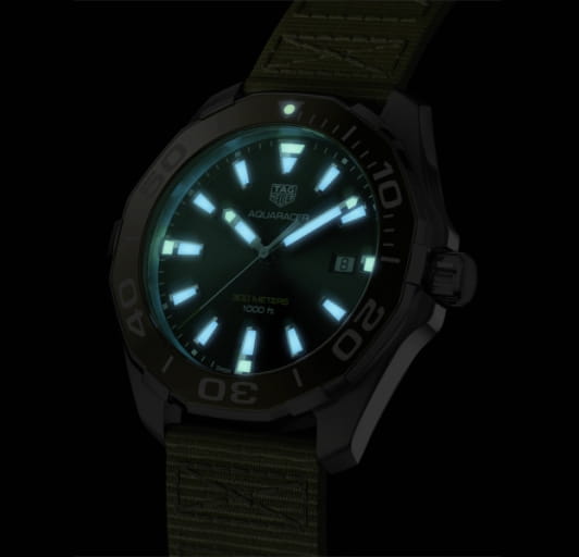 TAG Heuer Aquaracer WAY101E.FC8222 – элегантные мужские часы, сочетающие стиль и функциональность. Корпус диаметром 43 мм выполнен из нержавеющей стали с безелемБезельВнешний ободок, закрепляющий стекло. В спортивных часах так называется поворотное кольцо с делениями на циферблате, выполняет роль таймера – замеряет отрезки времени на шкале. Неподвижный безель – элемент декора. Однонаправленно вращающийся безель на дайверских часах позволяет фиксировать моменты погружения и выныривания на поверхность. из алюминия и стали с PVD-покрытиемPVDУльтратонкое покрытие наносится в технике вакуумного напыления, сочетает в себе нитрид титана особой прочности со слоем золота или оксида хрома. Несёт в себе декоративную или защитную функцию., устойчивым к царапинам. Тёмно-зелёный циферблат с солнечным узором оснащён накладными часовыми метками и стрелками с люминесцентным покрытиемЛюминесцентное покрытиеПозволяет считывать показания времени в темноте. Производители наносят на стрелки, часовые индексы, безель или поверхность циферблата светонакопительный состав, дающий холодное свечение., обеспечивающим отличную читаемость в любых условиях освещения. Часы оснащены точным кварцевым механизмом, гарантирующим надёжное отображение времени. Функциональность включает индикацию часов, минут, секунд и даты, расположенной на отметке «3 часа». Сапфировое стеклоСапфировое стеклоПрочный и надёжный материал из кристалла сапфира синтетического происхождения, характеризующийся особой твёрдостью и устойчивостью к царапинам и повреждениям. с антибликовым покрытиемАнтибликовое покрытиеСлой оксида металла в 0,13-0,3 микрон, благодаря которому стекло часов не бликует и не отражает свет. Антибликовое покрытие уменьшает отражение света в 10 раз, обеспечивая отличную читаемость показателей циферблата. обеспечивает защиту от царапин и превосходную читаемость. Тёмно-зелёный нейлоновый ремешок оснащён классической застёжкой-пряжкой из нержавеющей стали. Водозащита до 300 метров (30 бар) делает модель подходящей для дайвинга и других водных видов спорта.