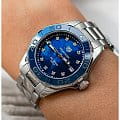 TAG Heuer Aquaracer WAY131L.BA0748 — элегантные женские часы, сочетающие стиль и функциональность. Корпус диаметром 35 мм и толщиной 10,75 мм выполнен из полированной нержавеющей стали, обеспечивая долговечность и устойчивость к коррозии. Лакированный циферблат оснащён накладными часовыми метками и стрелками с люминесцентным покрытиемЛюминесцентное покрытиеПозволяет считывать показания времени в темноте. Производители наносят на стрелки, часовые индексы, безель или поверхность циферблата светонакопительный состав, дающий холодное свечение., обеспечивающим отличную читаемость в любых условиях освещения. Его поверхность защищена сапфировым стекломСапфировое стеклоПрочный и надёжный материал из кристалла сапфира синтетического происхождения, характеризующийся особой твёрдостью и устойчивостью к царапинам и повреждениям., устойчивым к царапинам. Циферблат украшен 11 бриллиантами. Часы оснащены точным кварцевым механизмом, обеспечивающим стабильное отображение времени. Функциональность включает индикацию часов, минут, секунд и даты, расположенной на отметке «3 часа». БезельБезельВнешний ободок, закрепляющий стекло. В спортивных часах так называется поворотное кольцо с делениями на циферблате, выполняет роль таймера – замеряет отрезки времени на шкале. Неподвижный безель – элемент декора. Однонаправленно вращающийся безель на дайверских часах позволяет фиксировать моменты погружения и выныривания на поверхность. однонаправленный вращающийся, выполнен из стали, устойчивой к царапинам. Водозащита до 300 метров (30 бар) делает модель подходящей для дайвинга и активного образа жизни. Стальной браслет на раскладной застёжкеРаскладная застёжкаТакой тип застёжки используется только на браслетах из металла. Она никогда не раскрывается полностью, происходит разделение на 2 и более частей. Раскладывающая застёжка снизит вероятность потери часов к минимуму..