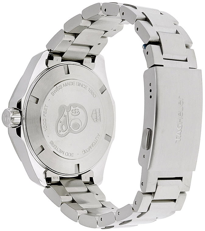 TAG Heuer Aquaracer WAY201B.BA0927 — стильные и надёжные часы, созданные для активного образа жизни и погружений. Корпус диаметром 43 мм выполнен из нержавеющей стали с матовой и полированной отделкой, что придаёт модели элегантный и динамичный вид. Однонаправленный вращающийся безельБезельВнешний ободок, закрепляющий стекло. В спортивных часах так называется поворотное кольцо с делениями на циферблате, выполняет роль таймера – замеряет отрезки времени на шкале. Неподвижный безель – элемент декора. Однонаправленно вращающийся безель на дайверских часах позволяет фиксировать моменты погружения и выныривания на поверхность. с керамической вставкой глубокого синего цвета оснащён минутной разметкой и светящимся маркером на позиции «12 часов», обеспечивая удобство при отсчёте времени погружения. Синий циферблат с горизонтальным гильоше дополнен накладными часовыми индексами и стрелками с люминесцентным покрытиемЛюминесцентное покрытиеПозволяет считывать показания времени в темноте. Производители наносят на стрелки, часовые индексы, безель или поверхность циферблата светонакопительный состав, дающий холодное свечение., что гарантирует превосходную читаемость в любых условиях освещения. Окошко даты с увеличительным стеклом расположено на отметке «3 часа» для удобства. Защиту циферблата обеспечивает сапфировое стеклоСапфировое стеклоПрочный и надёжный материал из кристалла сапфира синтетического происхождения, характеризующийся особой твёрдостью и устойчивостью к царапинам и повреждениям. с антибликовым покрытиемАнтибликовое покрытиеСлой оксида металла в 0,13-0,3 микрон, благодаря которому стекло часов не бликует и не отражает свет. Антибликовое покрытие уменьшает отражение света в 10 раз, обеспечивая отличную читаемость показателей циферблата.. Внутри установлен швейцарский автоматический механизм Calibre 5, обеспечивающий точность хода и запас энергии до 38 часов. Часы укомплектованы браслетом из нержавеющей стали с чередующейся полированной и матовой отделкой, а раскладная застёжкаРаскладная застёжкаТакой тип застёжки используется только на браслетах из металла. Она никогда не раскрывается полностью, происходит разделение на 2 и более частей. Раскладывающая застёжка снизит вероятность потери часов к минимуму. с двойной блокировкой и кнопками гарантирует надёжную фиксацию на запястье. Водонепроницаемость 300 метров делает модель идеальным выбором для занятий водными видами спорта, включая дайвинг.