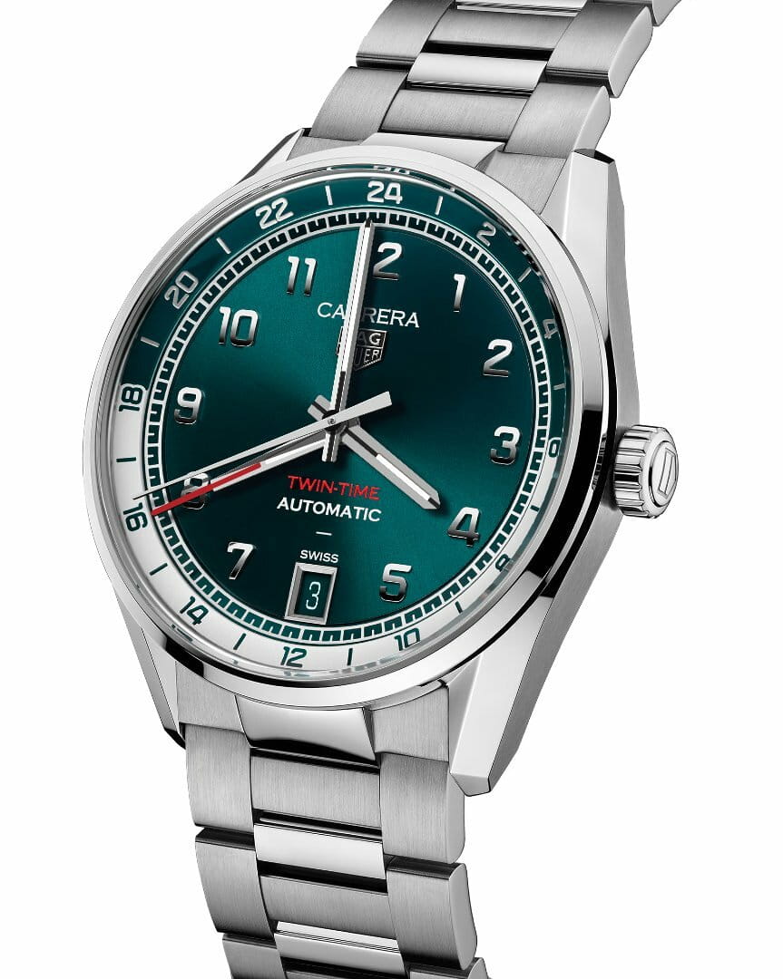 Утончённые часы TAG Heuer Carrera Date Twin-Time WDA2114.BA0043 созданы для стильных и смелых мужчин. Механический механизм (автоматический калибр) с высокой точностью производится целиком в стенах компании. Стальной корпус с диаметром 41 мм. Окно даты в положении «6 часов» органично вписывается в изысканный дизайн циферблата, а стальной корпус 41 мм и браслет обеспечивают универсальность модели. Сапфировое стеклоСапфировое стеклоПрочный и надёжный материал из кристалла сапфира синтетического происхождения, характеризующийся особой твёрдостью и устойчивостью к царапинам и повреждениям. с антибликовым покрытием, устойчивое к появлению царапин, обладающее высокой прозрачностью. Бирюзово-зеленый циферблат с эффектом солнечных лучей создает яркий, мгновенно узнаваемый образ. На стрелки нанесено люминесцентное покрытиеЛюминесцентное покрытиеПозволяет считывать показания времени в темноте. Производители наносят на стрелки, часовые индексы, безель или поверхность циферблата светонакопительный состав, дающий холодное свечение.. Класс водозащиты: 100 метров, позволит плавать, нырять и заниматься другими водными видами спорта. Браслет с раскладной застёжкойРаскладная застёжкаТакой тип застёжки используется только на браслетах из металла. Она никогда не раскрывается полностью, происходит разделение на 2 и более частей. Раскладывающая застёжка снизит вероятность потери часов к минимуму.. Часы с автоматическим механизмом имеют обновленный, более эргономичный дизайн корпуса и браслета. Данная модель отличается фирменными цифровыми индексами и характерной формой стрелки GMT.