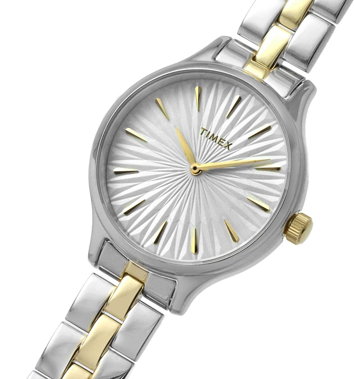 Наручные часы Timex TW2V06500 — это изящный аксессуар, который подчеркнет превосходный вкус своей обладательницы. Изготовленные в США, эти практичные женские часы оснащены надежным кварцевым механизмом, обеспечивающим точность хода. Корпус часов выполнен из латуни, которое придает изделию изысканный и современный вид. Белый циферблат украшен рельефным декоративным узором и оснащен листовидными стрелками в стиле Feuille, что обеспечивает элегантный внешний вид. Метки в виде штрихов и отсутствие секундной стрелки придают модели минималистичный стиль. Часы оснащены рифленой заводной головкой и надежным стальным браслетом с частичным PVDPVDУльтратонкое покрытие наносится в технике вакуумного напыления, сочетает в себе нитрид титана особой прочности со слоем золота или оксида хрома. Несёт в себе декоративную или защитную функцию. покрытием, который имеет раскладную застёжкуРаскладная застёжкаТакой тип застёжки используется только на браслетах из металла. Она никогда не раскрывается полностью, происходит разделение на 2 и более частей. Раскладывающая застёжка снизит вероятность потери часов к минимуму. для комфортной посадки на запястье. Водозащита 30WR позволяет носить часы в различных условиях, защищая их от случайных брызг. Минеральное стеклоМинеральное стеклоМинеральное стекло представляет собой искусственно выращенный минерал кварца. Такое стекло отличается особой устойчивостью к повреждениям и царапинам. Уступает по некоторым качествам сапфировому стеклу. защищает циферблат от царапин и повреждений, сохраняя его первозданный вид. Размеры корпуса составляют 36 мм в диаметре, а ширина браслета — 14 мм, что делает часы элегантными и подходящими для любого случая.